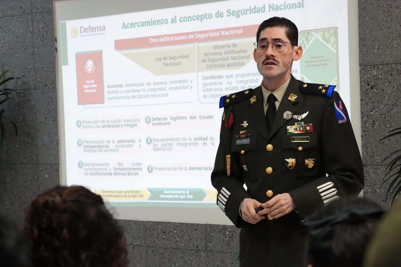 Como parte de su exposición, el coronel Bernabé Lemus explicó que la seguridad nacional se sustenta en tres grandes ejes: el entendimiento del concepto, las aspiraciones e intereses nacionales, y el papel de la Secretaría de la Defensa Nacional en este contexto. Señaló que las aspiraciones e intereses nacionales responden a los ideales y anhelos de la nación, orientados al bienestar, la estabilidad y la seguridad del país, como parte de una síntesis gestionada por el poder político del Estado.