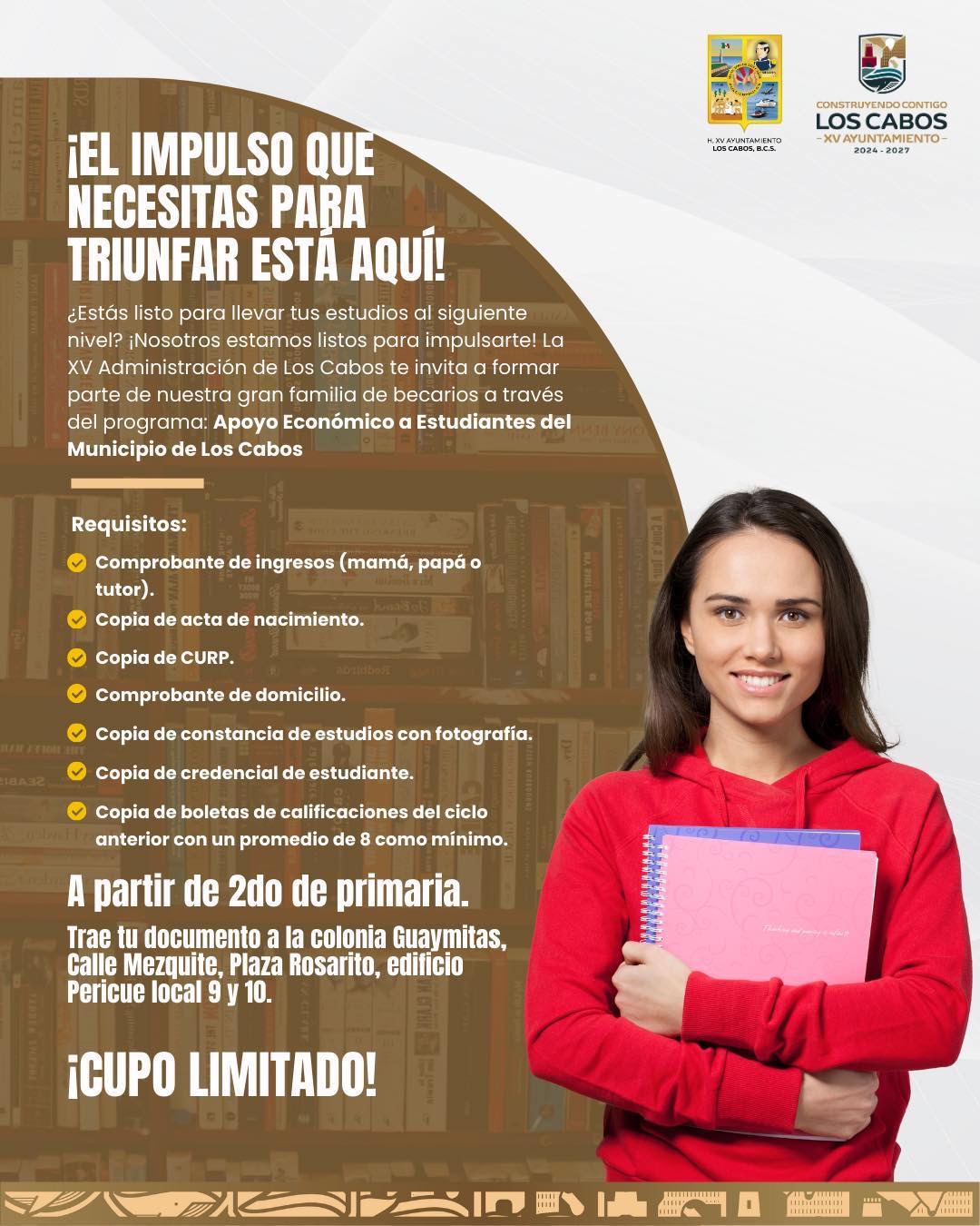 Este programa está diseñado para respaldar a estudiantes destacados y motivados, brindándoles un apoyo económico que contribuya a alcanzar sus metas académicas y profesionales, reafirmando el compromiso del Ayuntamiento de Los Cabos con la educación y el futuro de la niñez y juventud.