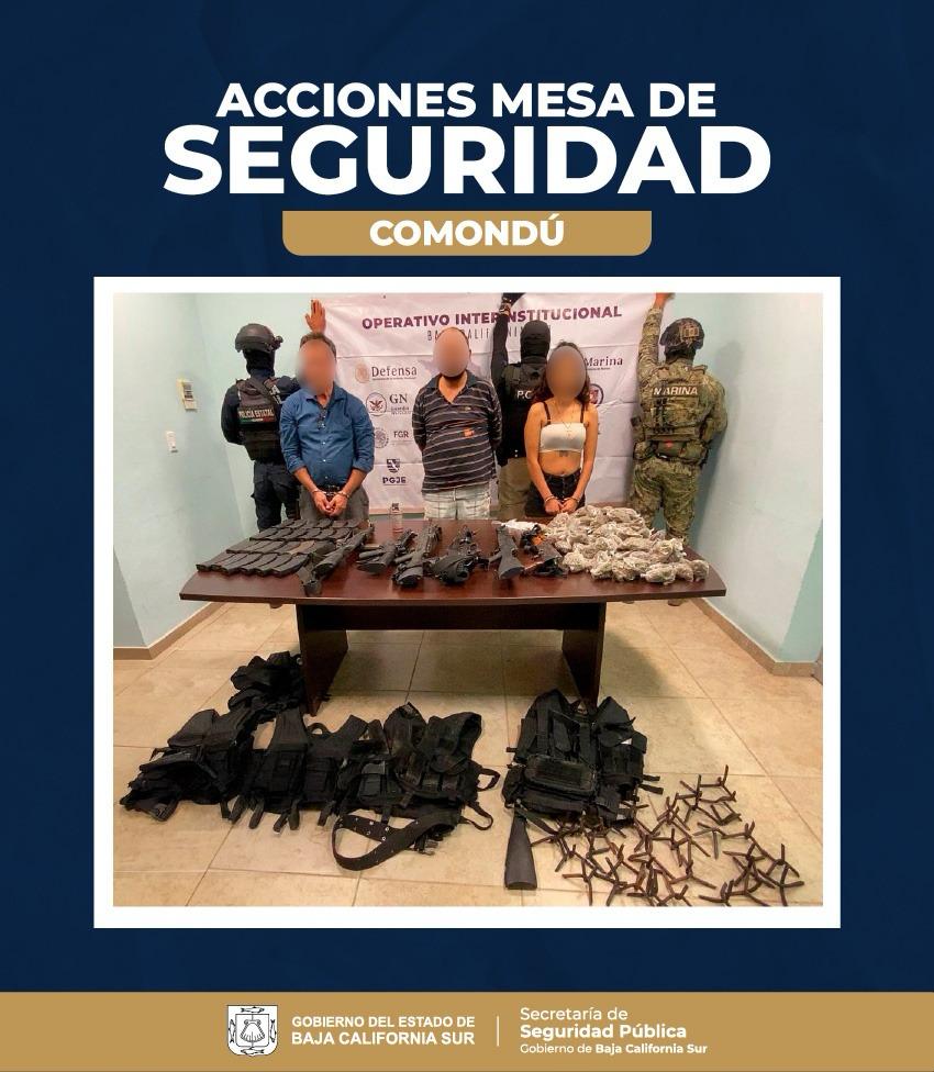 La Mesa Estatal de Seguridad informa que en una acción encabezada por personal de Marina, Policía Estatal Preventiva, Procuraría General de Justicia del Estado y la Policía Municipal de Comondú, en coordinación con Defensa, Guardia Nacional, Centro Nacional de Inteligencia y la Fiscalía General de la República, aseguraron armamento y detuvieron a tres generadores de violencia.