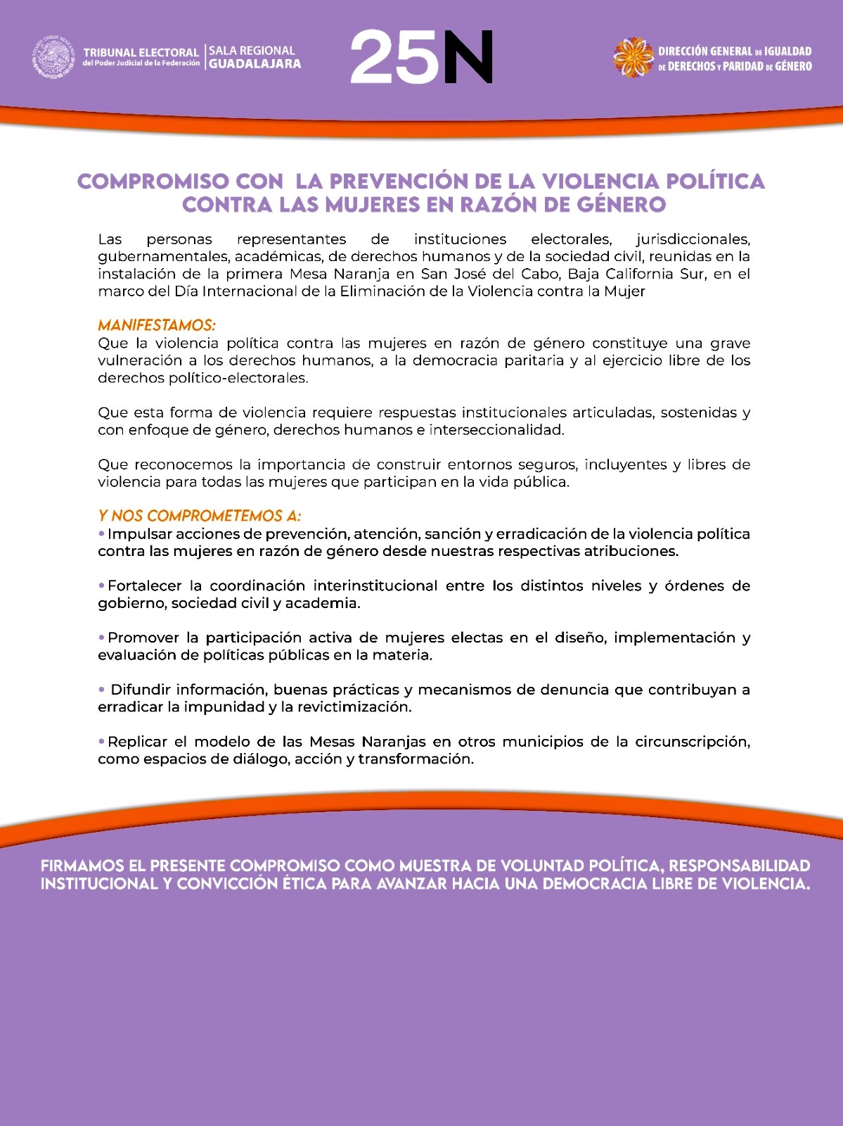 Los Cabos, Baja California Sur.- El XV Ayuntamiento de Los Cabos que preside Christian Agúndez Gómez a través del Instituto de las Mujeres del Municipio de Los Cabos (IMMLC), se suma a la instalación de la primera Mesa Naranja para la Prevención de la Violencia Política contra las Mujeres en Razón de Género, convocada por la Sala Regional Guadalajara del Tribunal Electoral del Poder Judicial de la Federación (TEPJF). Este encuentro se llevará a cabo el martes 25 de noviembre de 2025 a las 10:00 de la mañana en la Casa de la Cultura “Prof. Alfredo Green González”, en San José del Cabo, Baja California Sur.