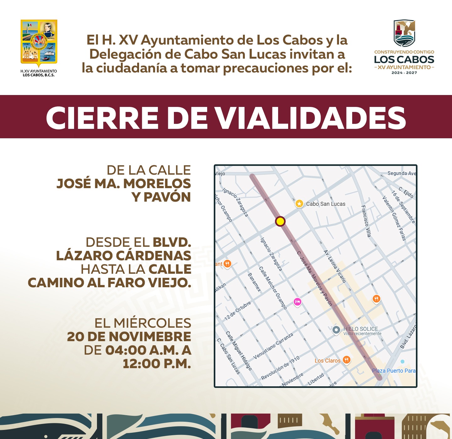 Los Cabos, Baja California Sur. – El XV Ayuntamiento de Los Cabos, informa que el próximo miércoles 20 de noviembre se realizará el cierre temporal de la calle Morelos desde el bulevar Lázaro Cárdenas hasta la Diagonal Morelos, así como las intersecciones que comprenden desde la avenida Leona Vicario y Melchor Ocampo, en Cabo San Lucas, en el horario 04:00 de la mañana hasta las 12:00 del día aproximadamente, lo anterior, en el marco del desfile cívico-deportivo conmemorativo a la Revolución Mexicana.