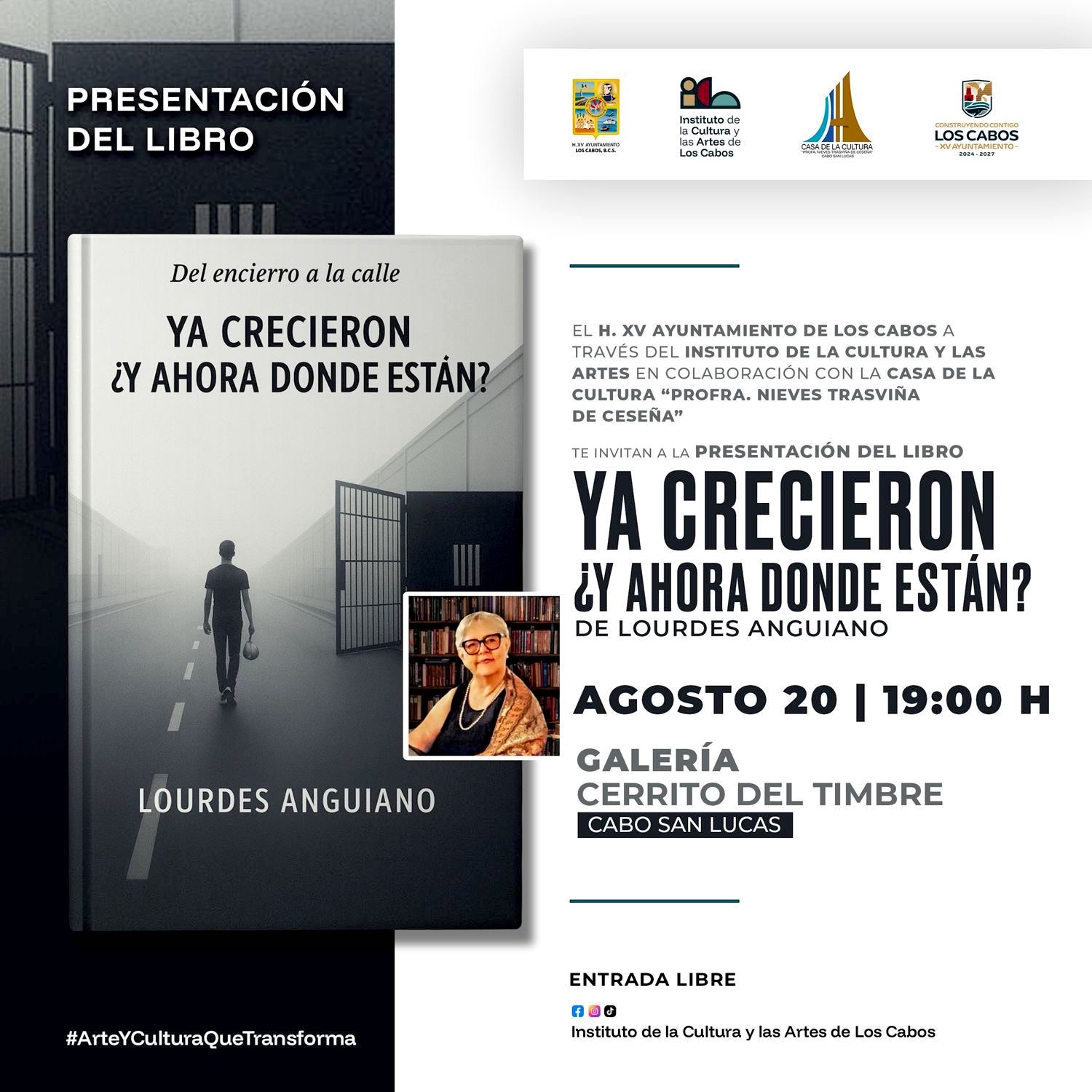 La titular de la dependencia Tanya Covarrubias Martínez, informó el miércoles 20 de agosto a las 07:00 de la tarde, se llevará a cabo la presentación del libro “Ya crecieron ¿y ahora dónde están?” de la escritora Lourdes Anguiano, en la Galería de Arte “Cerrito del Timbre” de la Casa de Cultura “Profa. Nieves Trasviña de Ceseña”, en Cabo San Lucas.