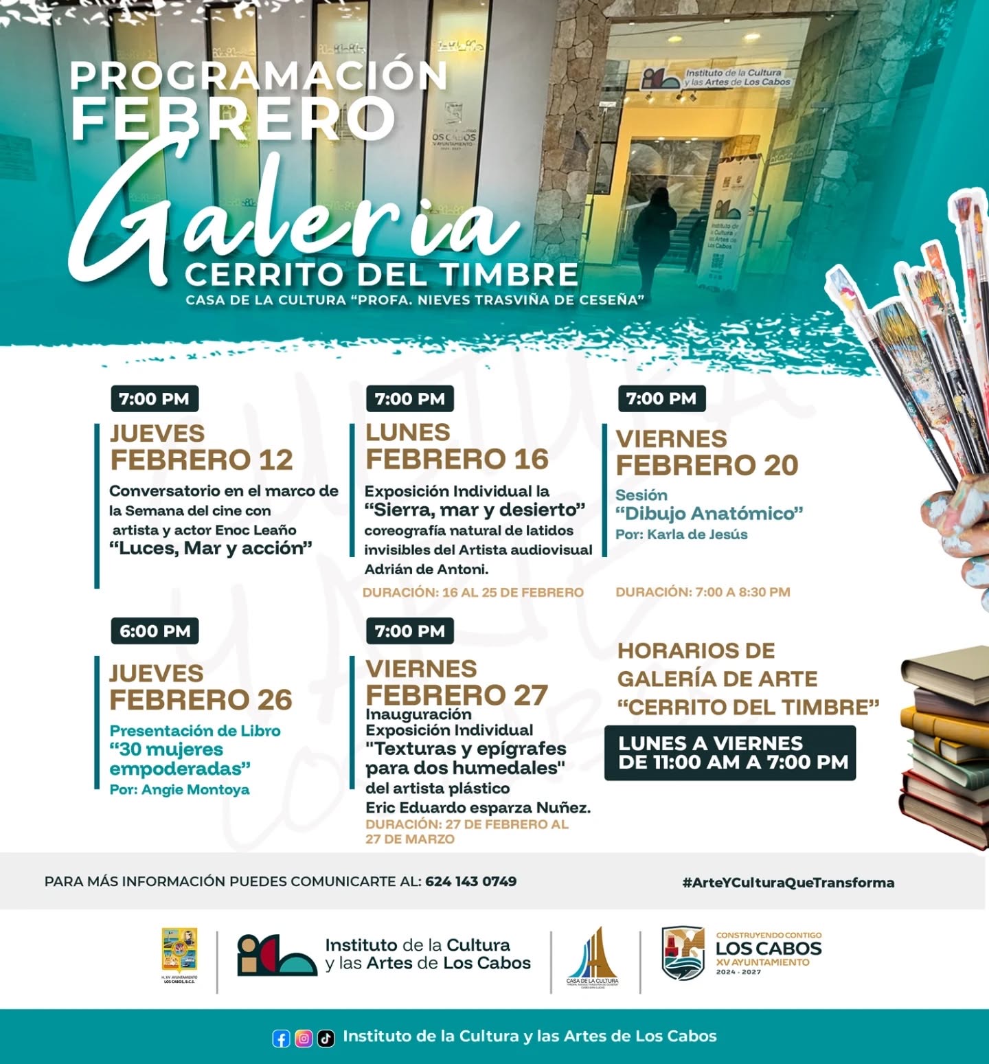 El XV Ayuntamiento de Los Cabos invita a la ciudadanía a formar parte de esta agenda cultural y a continuar fortaleciendo el arte y la cultura como herramientas de transformación social. Para mayores informes, las personas interesadas pueden comunicarse al teléfono 624 143 0749.