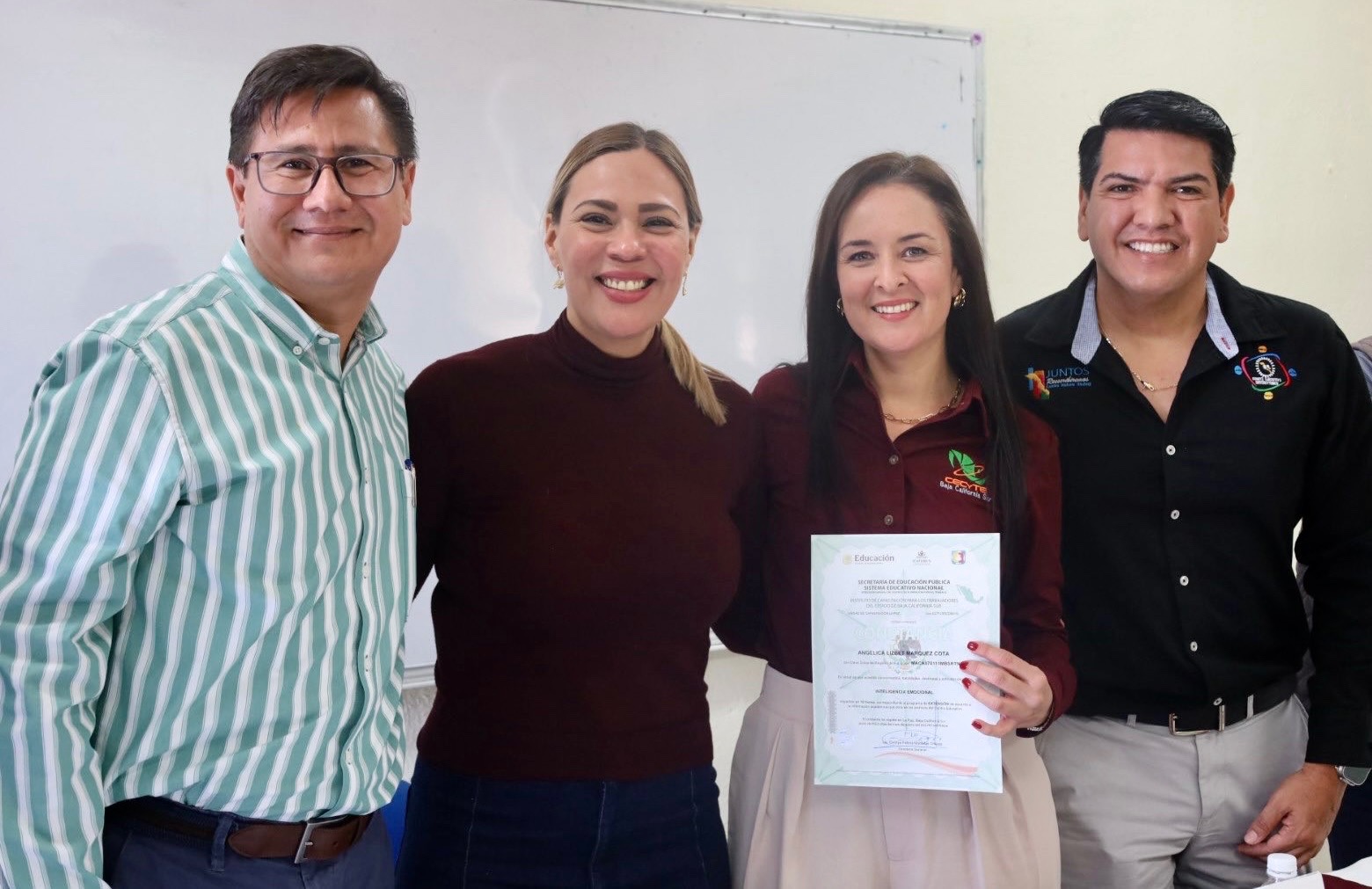 Durante la entrega de constancias estuvieron presentes el director general del Cectebcs, Vladimir Torres Navarro; el secretario del Trabajo, Bienestar y Desarrollo Social, Omar Antonio Zavala Agúndez y el secretario general del Sutcectebcs, Edel Noé Mares Rodríguez.