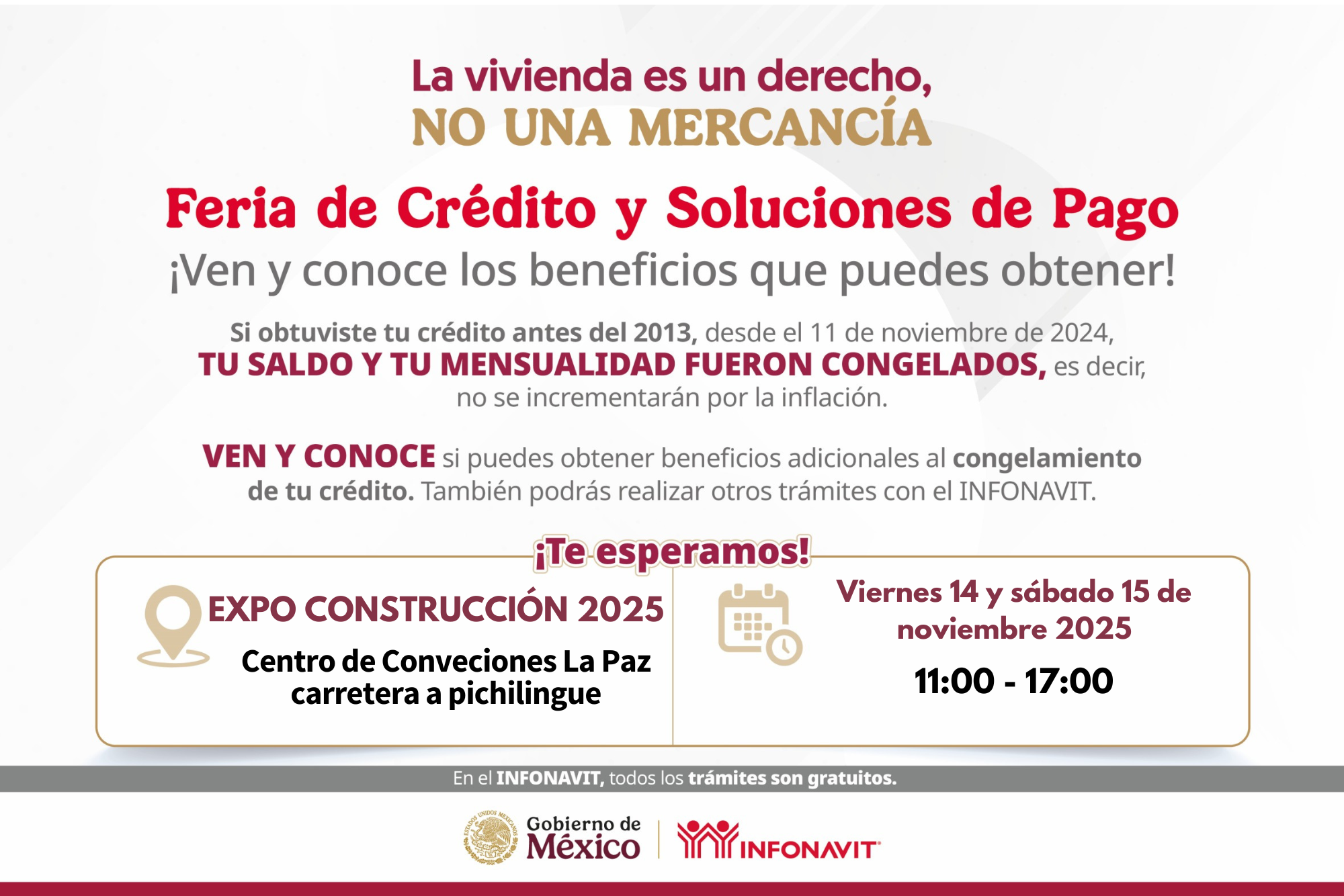 La atención se brindará el viernes 14 y sábado 15 de noviembre, de 11:00 a 17:00 horas, dentro de la Expo Construcción CMIC 2025, en el Centro de Convenciones de La Paz, ubicado sobre la carretera Escénica km 5, en el tramo Pichilingue.