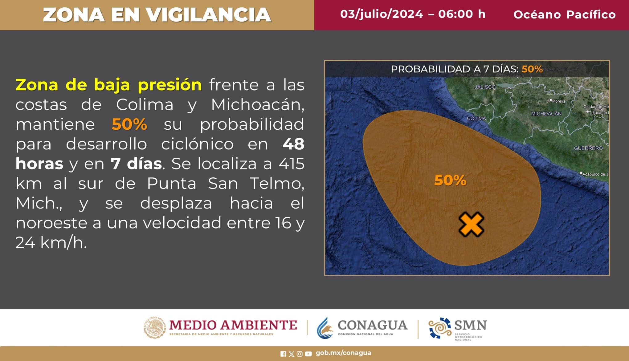 Los Cabos, B.C.S., 03 julio 2024.- La Dirección Municipal de Protección Civil, informa que la amplia zona de baja presión en el Océano Pacífico mantiene una probabilidad del 50% para desarrollo ciclónico en un lapso de 48 horas a 7 días.