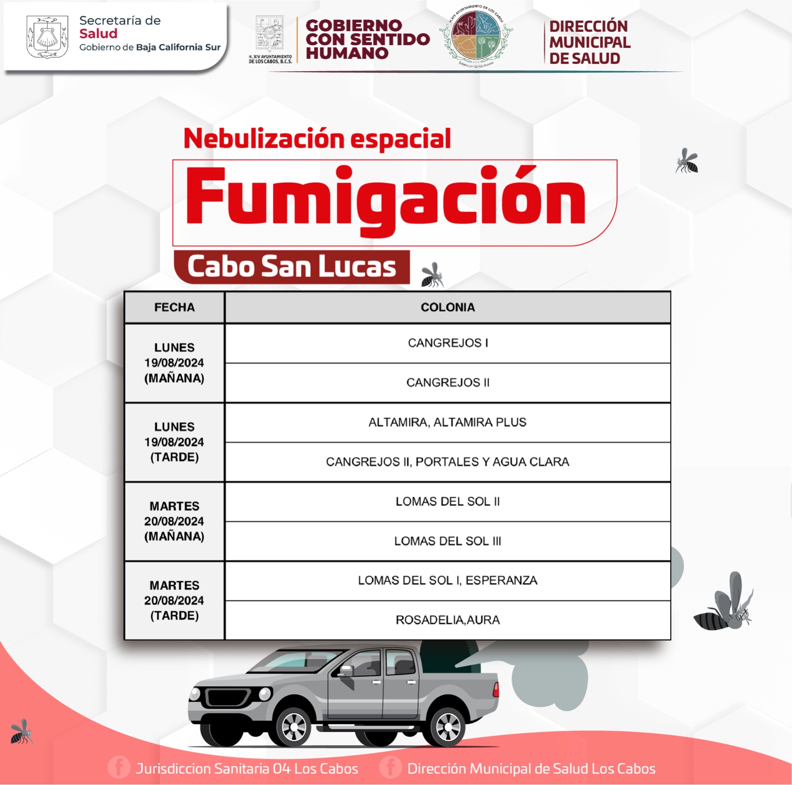 Se informa a las y los habitantes del municipio de Los Cabos que personal altamente capacitado y con maquinaria especial recorrerá las colonias de la Delegación de Cabo San Lucas en diferentes horarios, por lo que se pide la colaboración de la población para que al escuchar el inicio de las nebulizaciones espaciales, se abran puertas y ventanas para que el químico entre a sus hogares, cabe mencionar que éste no es tóxico para las personas ni para las mascotas.