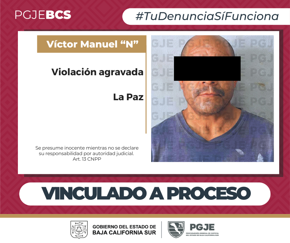 La Procuraduría General de Justicia del Estado (PGJE) de Baja California Sur obtuvo la vinculación a proceso de Víctor Manuel “N”, de 48 años, por su probable responsabilidad en el delito de violación agravada en perjuicio de una adolescente.
