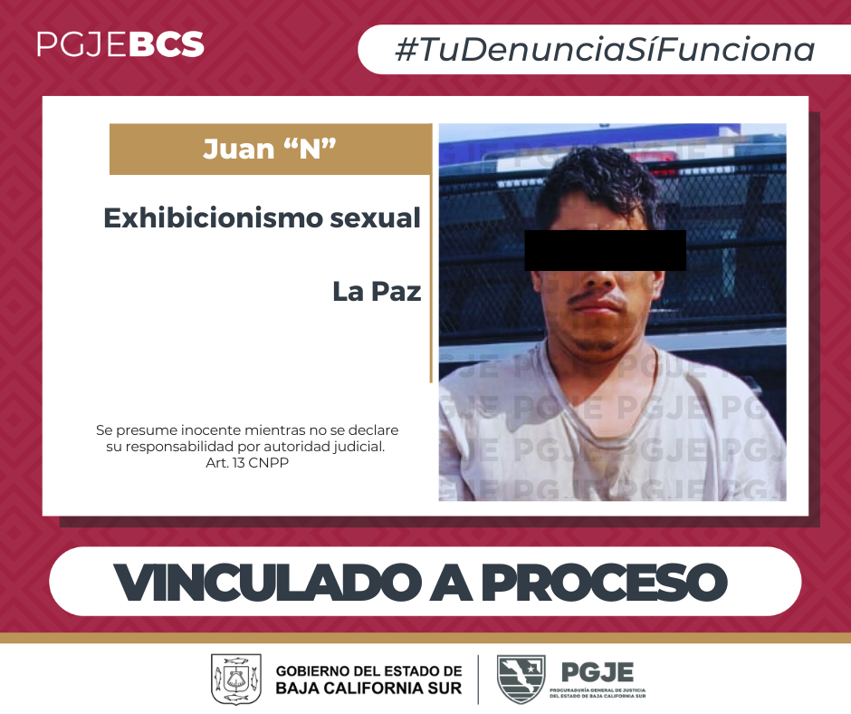 La Procuraduría General de Justicia del Estado (PGJE) de Baja California Sur, obtuvo la vinculación a proceso de Juan Carlos “N” por el delito de exhibicionismo corporal, tras los hechos ocurridos la mañana del 20 de febrero en la colonia Centro de la ciudad de La Paz.