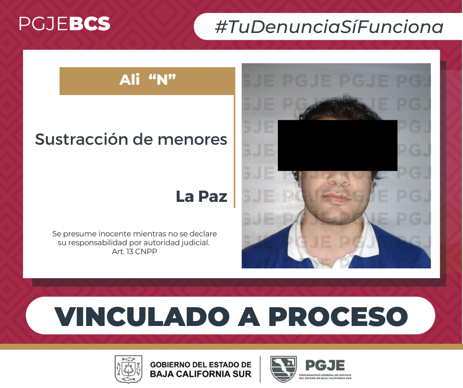 La Procuraduría General de Justicia del Estado (PGJE) de Baja California Sur, obtuvo la vinculación a proceso de Ali “N” por el delito de sustracción de personas menores de edad cuando, teniendo la Patria Potestad, no ejerza la guarda y custodia de hecho, sobre el sujeto pasivo, hechos ocurridos el mes de octubre del 2023 en la ciudad de La Paz.