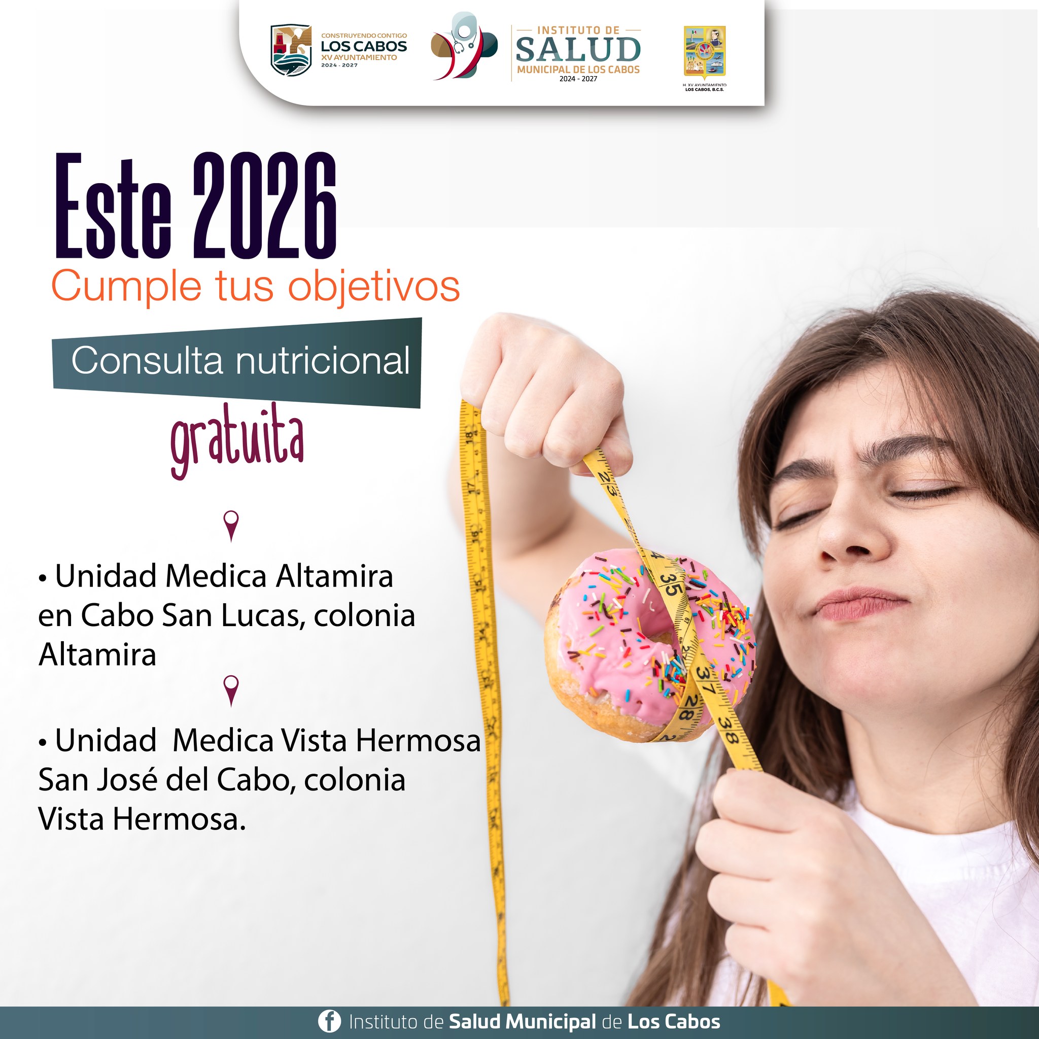El XV Ayuntamiento de Los Cabos extiende una invitación a la población para que acuda a las consultas nutricionales que se ofrecen tanto en la Unidad Médica de la colonia Altamira como en la Unidad Médica de la colonia Vista Hermosa, espacios diseñados para brindar atención cercana, profesional y de calidad.
