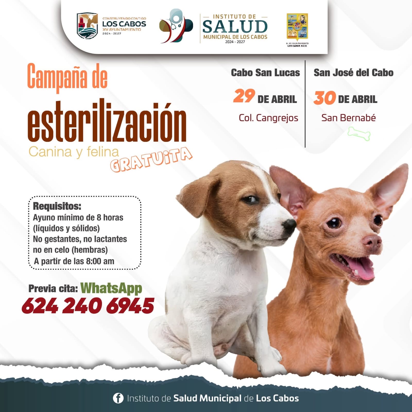 Los Cabos, Baja California Sur.– El XV Ayuntamiento de Los Cabos, a través del Instituto de Salud Municipal, invita a la ciudadanía a participar en la jornada gratuita de esterilización canina y felina que se llevará a cabo los días 29 y 30 de abril en Cabo San Lucas y San José del Cabo.