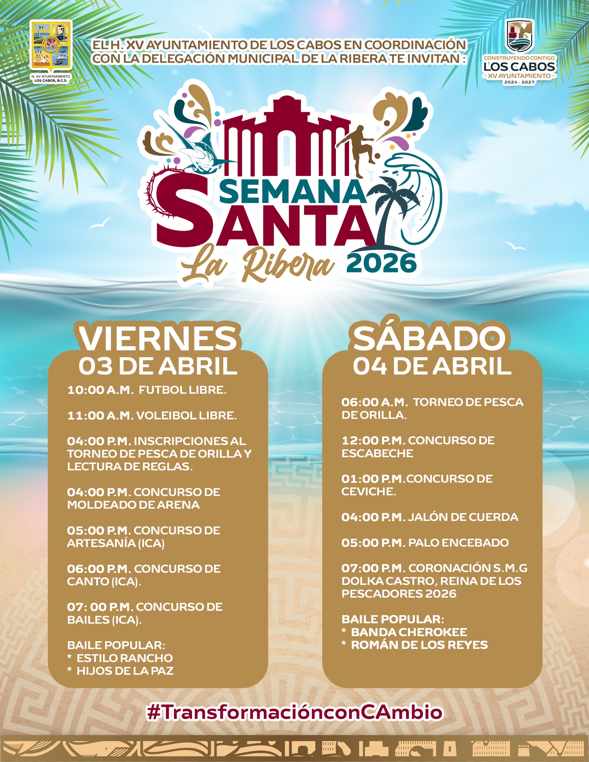 Los Cabos, Baja California Sur.– El XV Ayuntamiento de Los Cabos, en coordinación con la Delegación Municipal de La Ribera, invita a la ciudadanía a participar en las actividades programadas con motivo de Semana Santa La Ribera 2026, a realizarse los días 3 y 4 de abril.