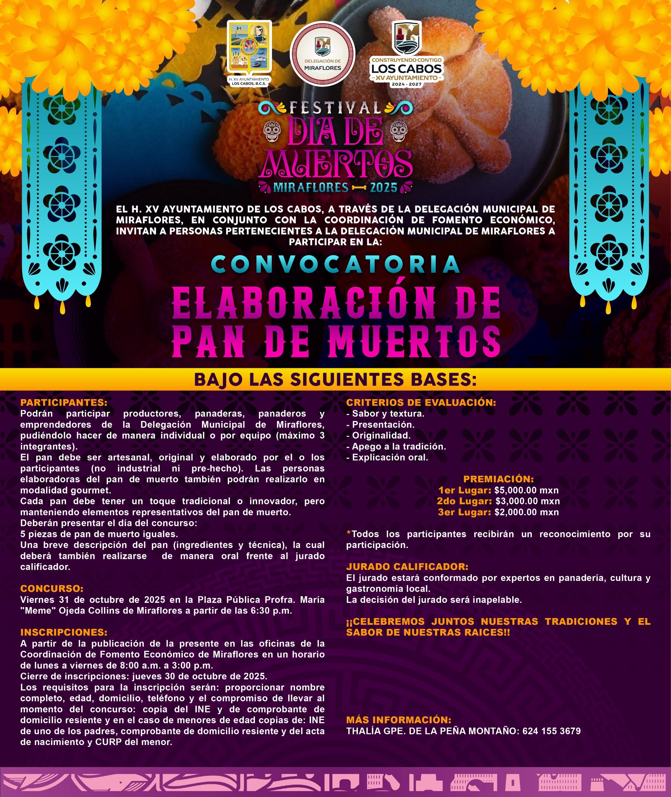 Los Cabos, Baja California Sur.– El XV Ayuntamiento de Los Cabos, a través de la Delegación Municipal de Miraflores y sus distintas coordinaciones, invita a la ciudadanía a participar en el Festival Día de Muertos Miraflores 2025, que se llevará a cabo este viernes 31 de octubre en la plaza pública Profesora María “Meme” Ojeda Collins, bajo el lema “En el altar del corazón, nunca muere la tradición”.