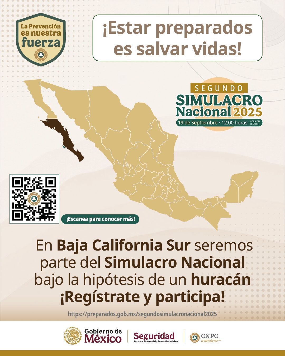 El Gobierno de Baja California Sur invita a la población a participar en el Segundo Simulacro Nacional 2025, como parte de las acciones implementadas de manera conjunta con la Federación, municipios y la sociedad, con el objetivo de fortalecer la cultura de la protección civil. Este ejercicio se llevará a cabo el viernes 19 de septiembre, a las 11:00 horas (tiempo del Pacífico), informó el secretario General de Gobierno, José Saúl González Núñez.