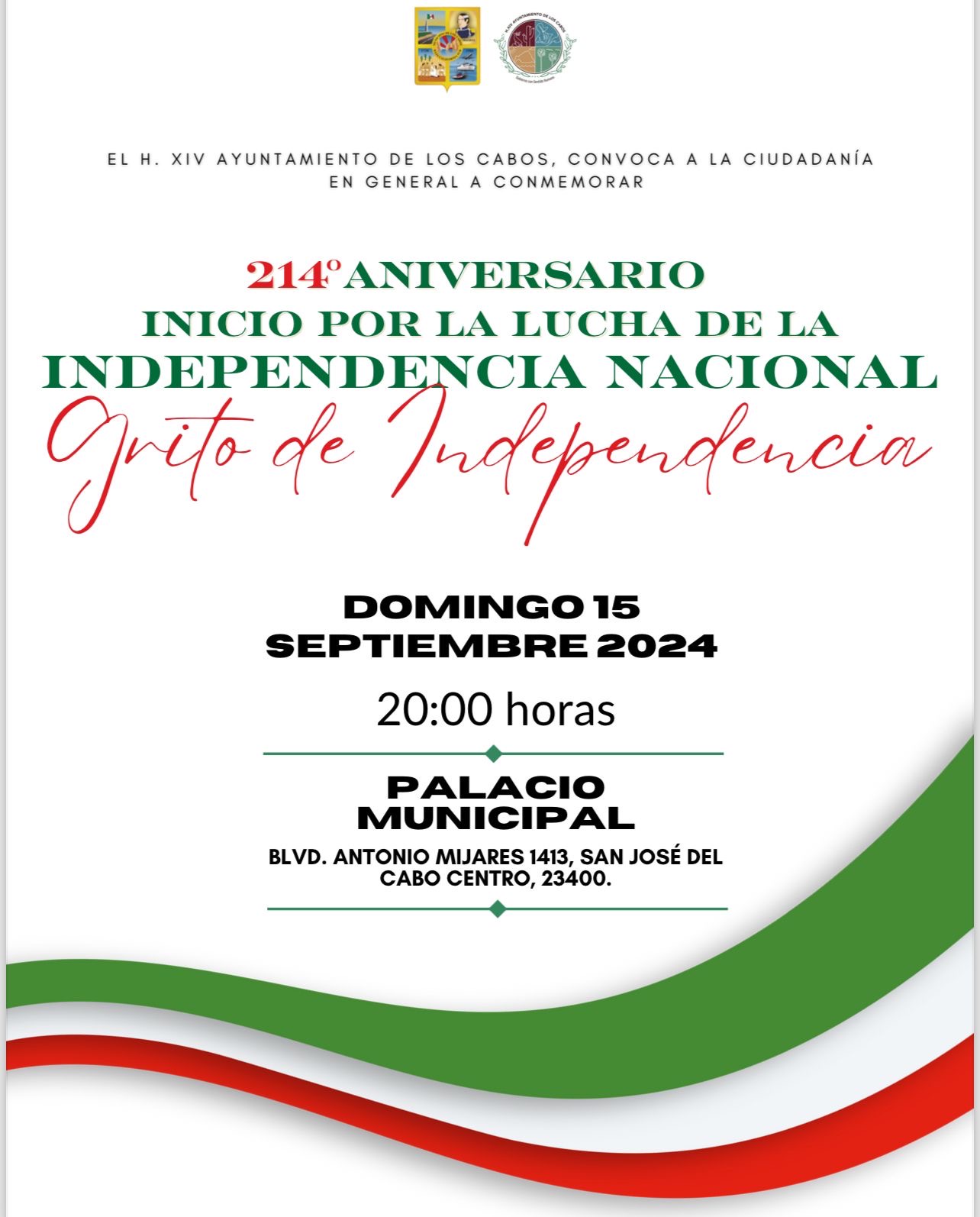 Los Cabos B.C.S., 15 de septiembre de 2024.- Con motivo del 214° aniversario de la Independencia de México, el XIV Ayuntamiento de Los Cabos, invita a la población a conmemorar este domingo 15 de septiembre, el tradicional Grito de Independencia encabezado por el presidente municipal Oscar Leggs Castro, en la plaza pública Antonio Teniente Mijares, en la cabecera municipal a partir de las 5:00 de la tarde.