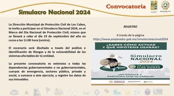 Los Cabos B.C.S., a 17 de septiembre del 2024.- En México se llevará a cabo el Simulacro Nacional de Sismos 2024, por ello, el Gobierno de Los Cabos que preside Oscar Leggs Castro, invita a la población a participar el próximo jueves 19 de septiembre a las 10:00 de la mañana en este magno ejercicio preventivo que tiene como propósito difundir la cultura de la protección civil y concientizar a la ciudadanía sobre la importancia de la gestión de riesgos.