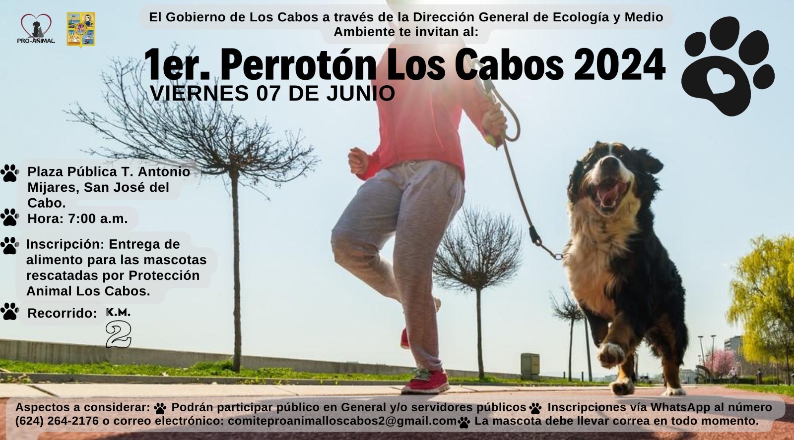 Los Cabos, B.C.S., 29 de mayo del 2024.- Como parte de las actividades que se llevarán a cabo por el Día Mundial del Medio Ambiente este próximo 07 de junio, la Dirección General de Ecología y Medio Ambiente a través de la Coordinación Municipal de Protección Animal invita a la ciudadanía a participar en el 1er. Perrotón Los Cabos 2024.