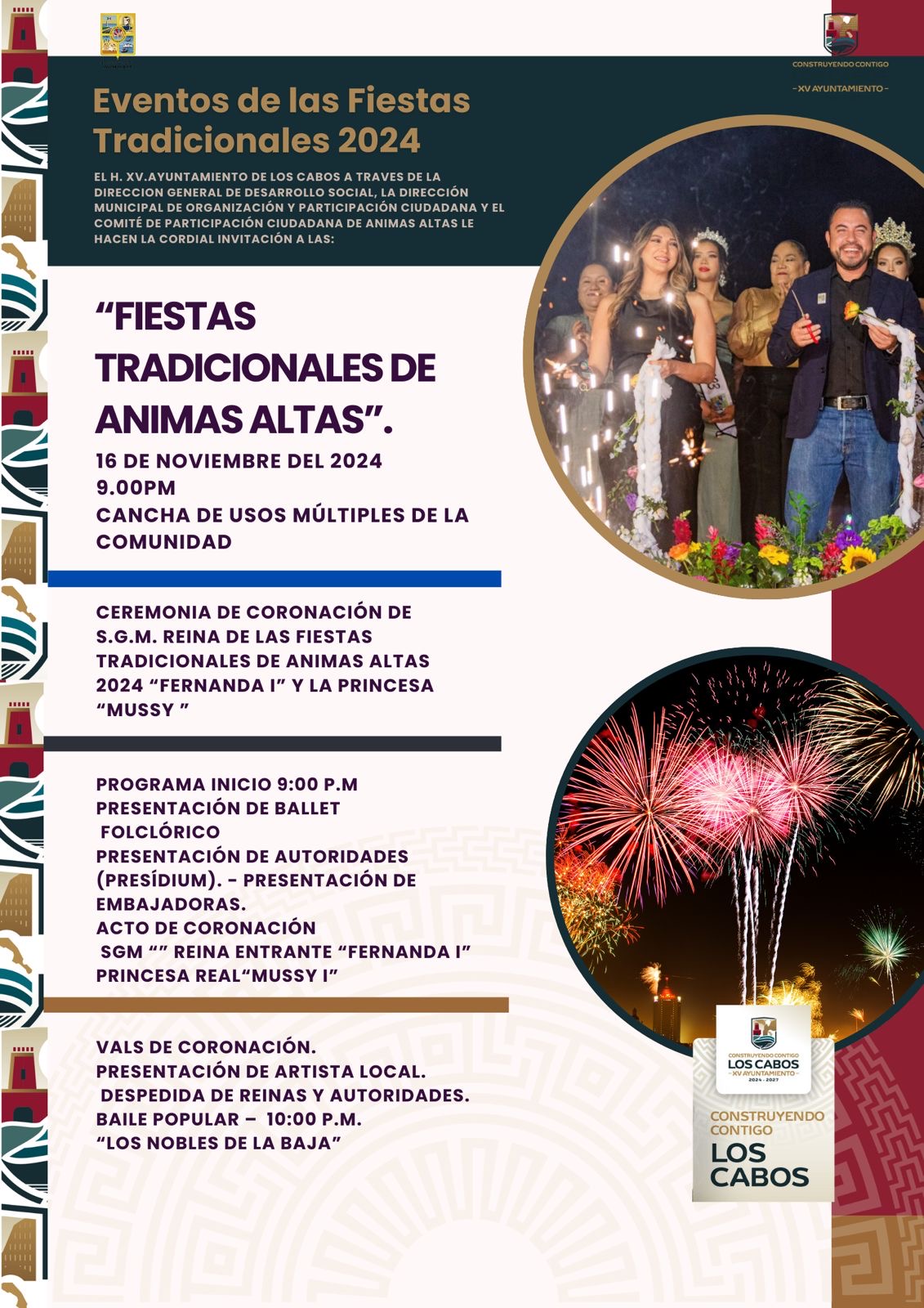 Para finalizar, integrantes del Comité de las Fiestas Tradicionales de Animas Altas 2024, comentaron que posteriormente se realizará el vals de coronación de la reina “Fernanda I” y la princesa real “Mussy I”. Para concluir la celebración se llevará a cabo un programa artístico con la presentación del Grupo musical “Nobles de la Baja” a partir de las 20:00 horas.