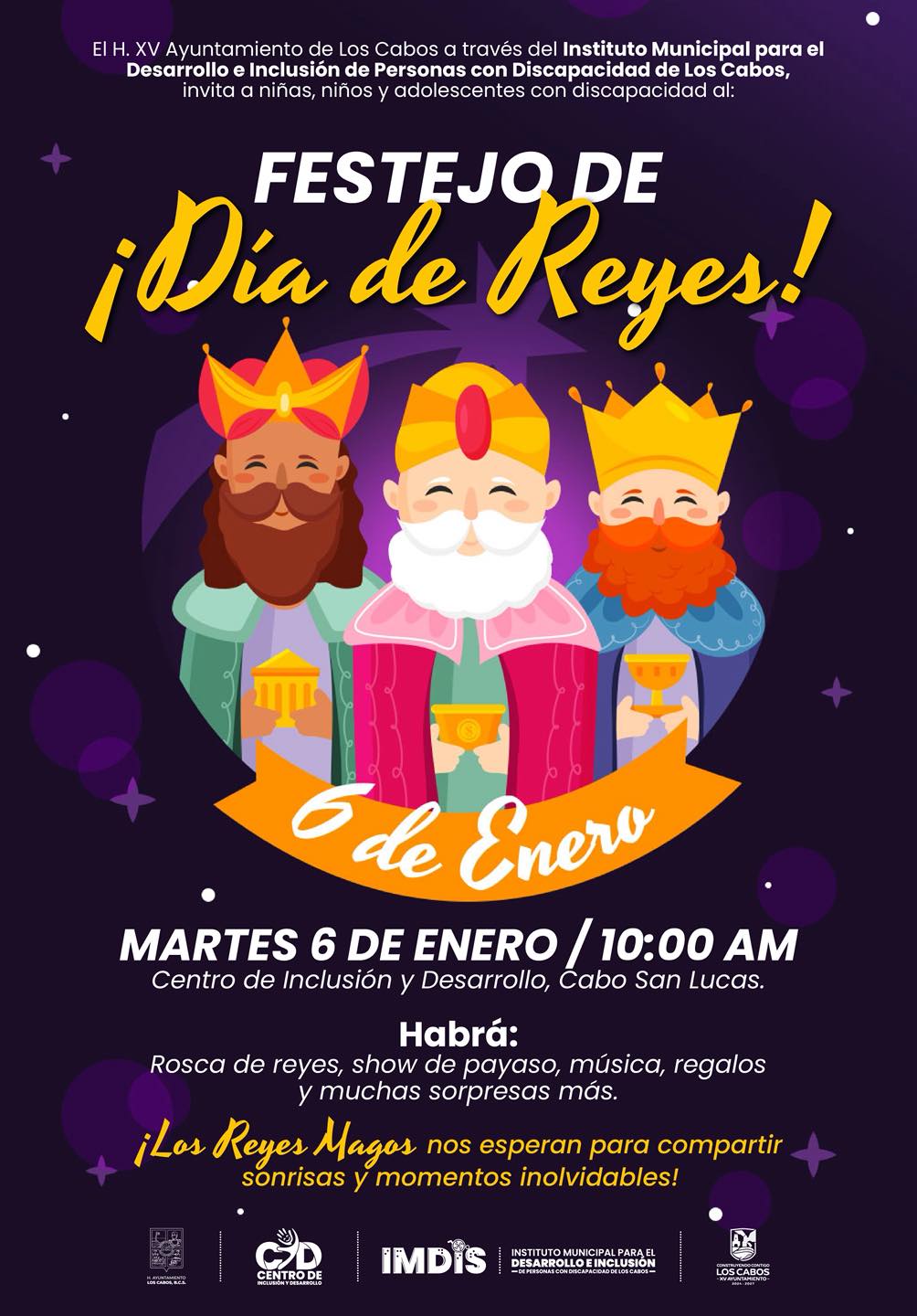 Los Cabos, Baja California Sur.– El XV Ayuntamiento de Los Cabos, a través del Instituto Municipal para el Desarrollo e Inclusión de Personas con Discapacidad de Los Cabos (IMDIS), invita a niñas, niños y adolescentes con discapacidad a participar en el festejo con motivo del Día de Reyes, diseñado como un espacio de convivencia, recreación e inclusión.