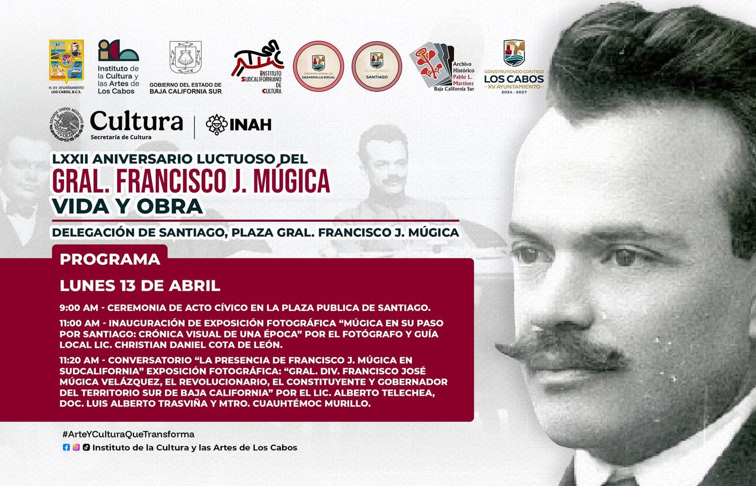 Los Cabos, Baja California Sur.– El XV Ayuntamiento de Los Cabos, a través del Instituto de la Cultura y las Artes (ICA), en coordinación con el Gobierno de Baja California Sur, el Instituto Sudcaliforniano de Cultura, el Archivo Histórico “Pablo L. Martínez”, la Dirección General de Desarrollo Social y la Delegación de Santiago, convocan a la ciudadanía a participar en la conmemoración del LXXII Aniversario Luctuoso del Gral. Francisco J. Múgica.