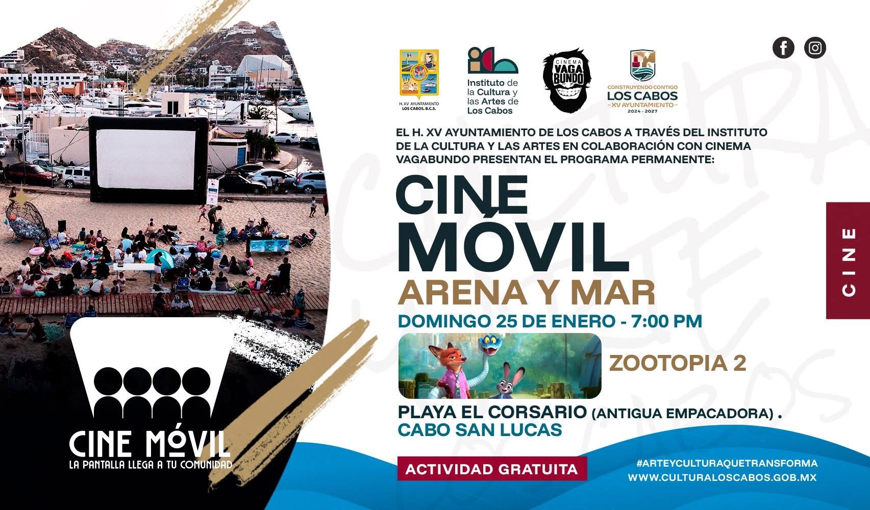 Los Cabos, Baja California Sur.– El XV Ayuntamiento de Los Cabos, a través del Instituto de la Cultura y las Artes (ICA), y en colaboración con Cinema Vagabundo, invita a la ciudadanía a disfrutar de una función especial de cine al aire libre en playa El Corsario, en Cabo San Lucas.