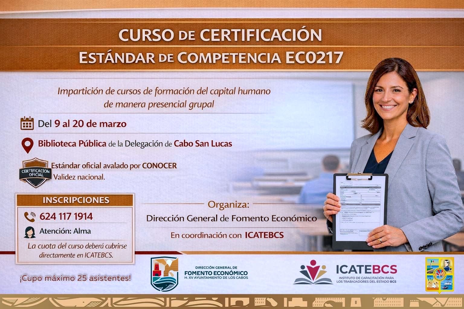 El proceso de certificación se realizará del 9 al 20 de marzo en la Biblioteca Pública de la Delegación de Cabo San Lucas. El estándar cuenta con el aval de CONOCER, lo que garantiza una certificación con validez oficial a nivel nacional para quienes planifican, imparten y evalúan procesos formativos.