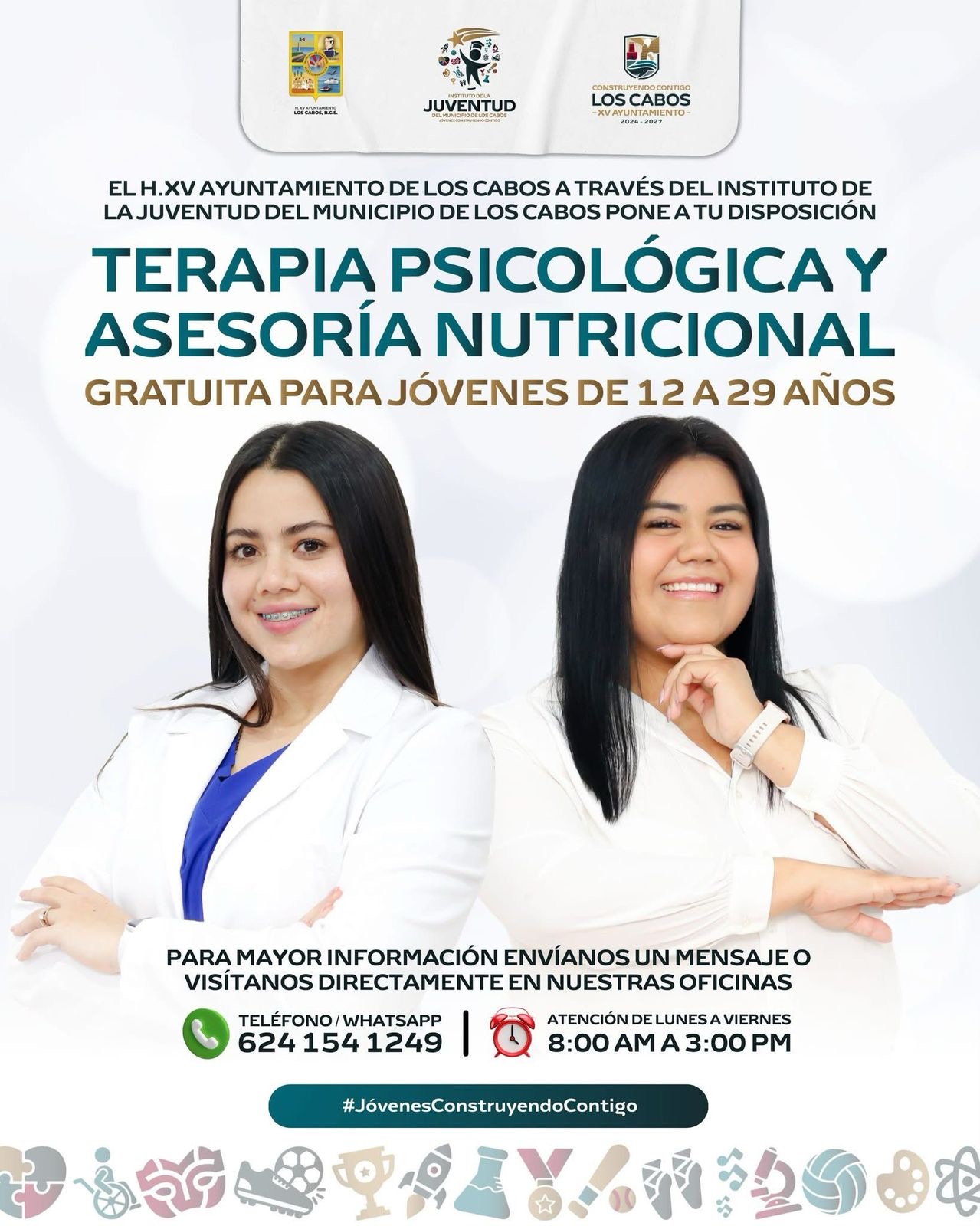 Los Cabos, Baja California Sur.- El XV Ayuntamiento de Los Cabos, a través del Instituto de la Juventud (Injuve) invita a la población de 12 a 29 años de edad a hacer uso de los servicios de asesoría psicológica y nutricional que se ofrecen de manera gratuita por parte de dicha dependencia.