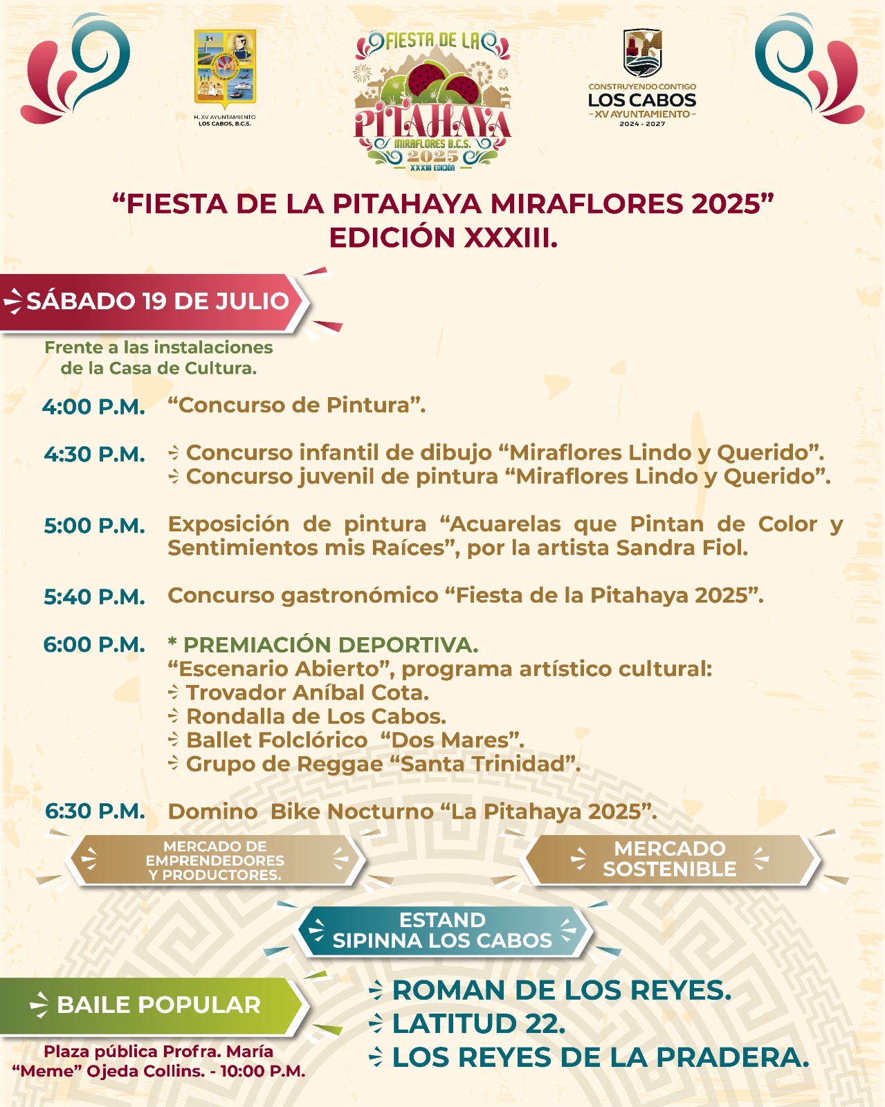 Este tradicional evento contará con un amplio programa de actividades. El sábado 19 de julio se llevarán a cabo concursos de pintura, dibujo infantil y juvenil, concurso gastronómico, así como la instalación del mercado de emprendedores, mercado sostenible y la participación de SIPINNA Los Cabos. A lo largo de la tarde habrá presentaciones musicales, y por la noche se celebrará un gran baile popular con la actuación de Román de los Reyes, Latitud 22 y Los Reyes de la Pradera, a partir de las 21:00 horas.