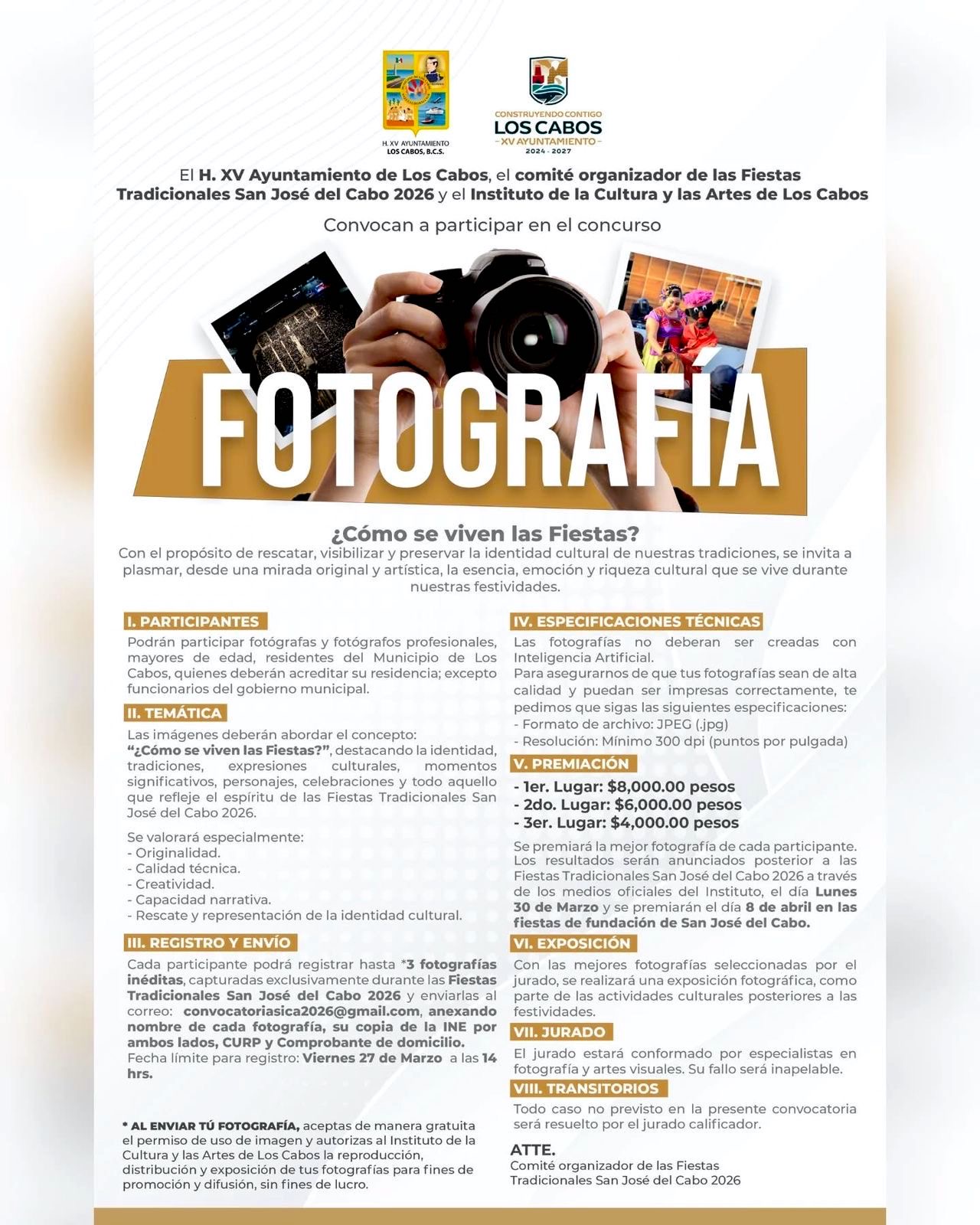 Los Cabos, Baja California Sur.– El XV Ayuntamiento de Los Cabos, a través del Instituto de la Cultura y las Artes (ICA) y el Comité Organizador de las Fiestas Tradicionales San José del Cabo 2026, convoca a fotógrafas y fotógrafos residentes del municipio a participar en el concurso de fotografía con la temática “¿Cómo se viven las Fiestas?”.