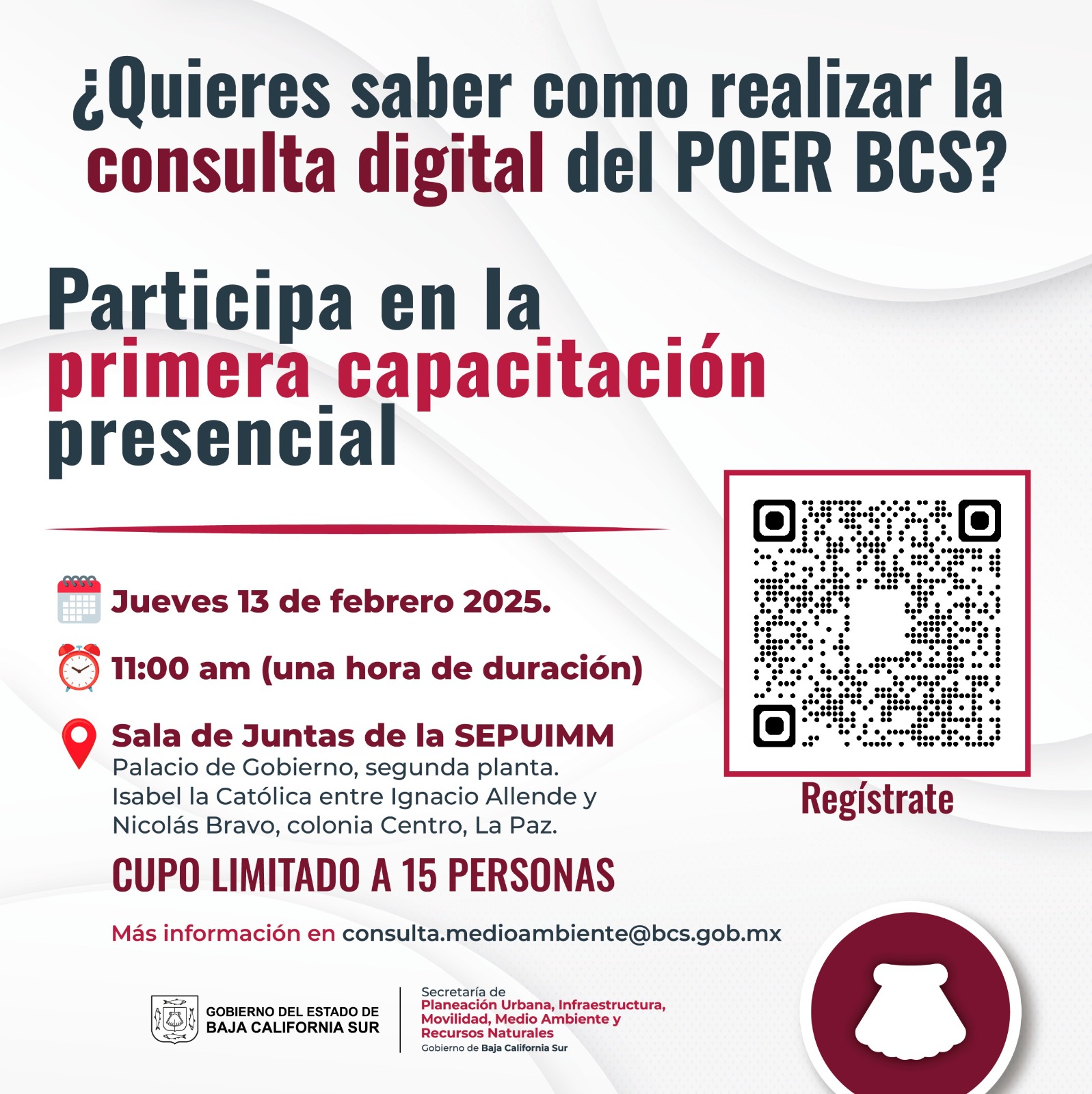 Como parte del proceso de socialización de la consulta pública del Programa de Ordenamiento Ecológico Regional de Baja California Sur (POER), la Secretaría de Planeación Urbana, Infraestructura, Movilidad, Medio Ambiente y Recursos Naturales (SEPUIMM), llevará a cabo capacitaciones dirigidas a todas aquellas personas interesadas en acceder y revisar los documentos y mapas que forman parte de dicha propuesta.