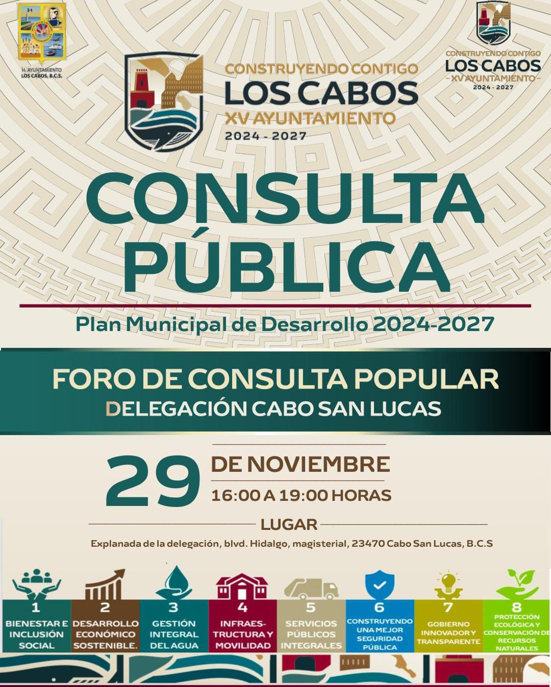 Los Cabos, Baja California Sur.- A partir de las 16:00 horas de este viernes 29 de noviembre, se instalarán las mesas de trabajo para recibir las propuestas de la sociedad durante el Foro de Consulta Popular que se desarrollará en explanada delegacional de Cabo San Lucas, cuya finalidad es incluir las peticiones y demandas de la ciudadanía para planear los trabajos de los próximos 3 años del XV Ayuntamiento de Los Cabos.