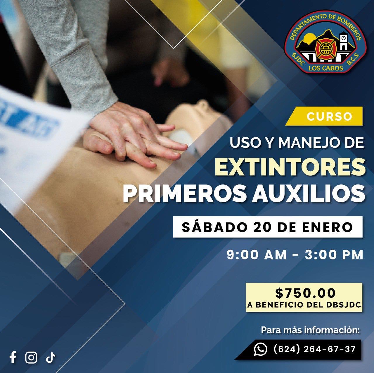 Los Cabos, B.C.S., 18 de enero 2024.- A solicitud expresa de la ciudadanía, así como de la iniciativa privada, el Departamento de Bomberos de San José del Cabo hace una cordial invitación al público en general a ser parte del curso “Primeros Auxilios y Manejo de Extintores”, con una cuota de recuperación de $750 pesos por persona este próximo sábado 20 de enero de 9:00 de la mañana a 3:00 de la tarde en la Estación #1 de la colonia Centro.