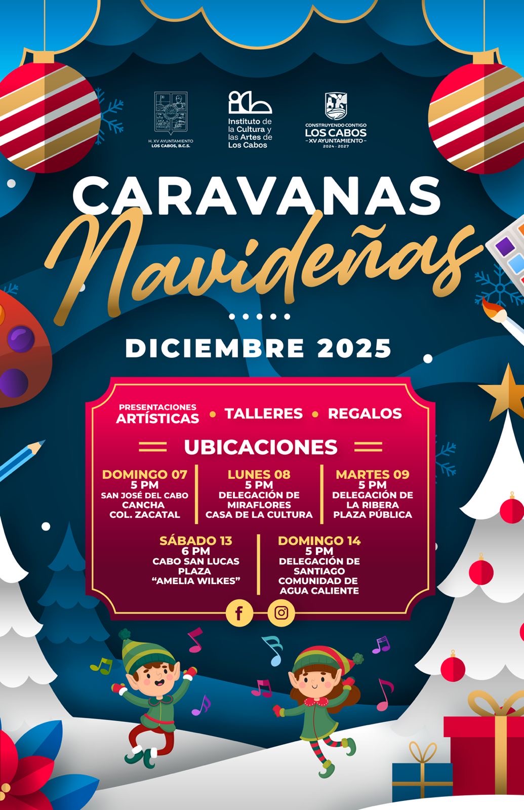 Los Cabos, Baja California Sur.- El XV Ayuntamiento de Los Cabos, a través del Instituto de la Cultura y las Artes (ICA), a cargo de Tanya Covarrubias Martínez anunció el programa de actividades navideñas gratuitas que se realizarán durante diciembre, con el propósito de fortalecer la convivencia comunitaria y preservar las tradiciones de la temporada.