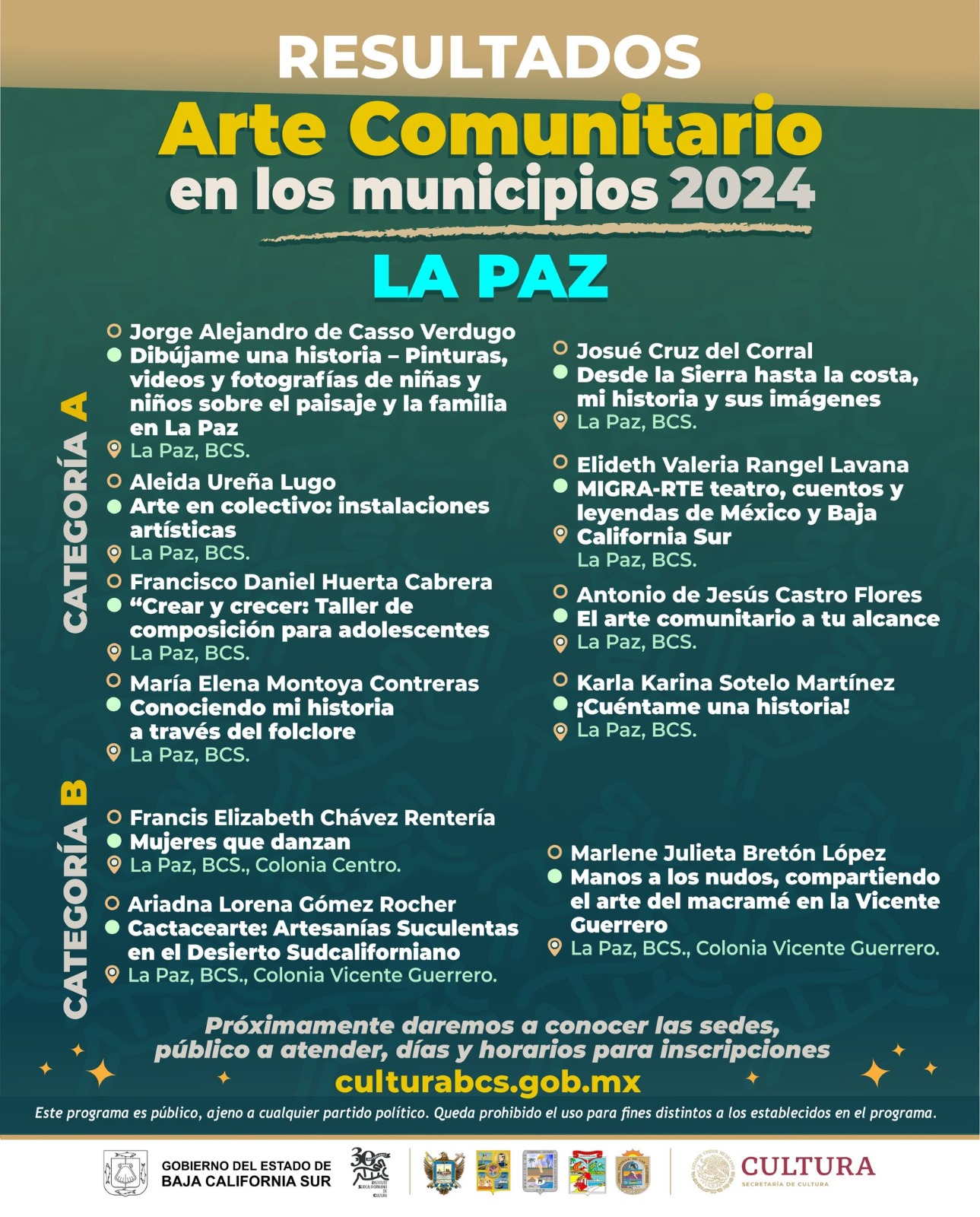 Finalmente, Caballero Gutiérrez detalló para más información, visitar el sitio web culturabcs.gob.mxo bien, comunicarse al número telefónico 612 12-2 15-75, para conocer las sedes, días y horarios para inscripciones a los talleres que surgirán de este proyecto.