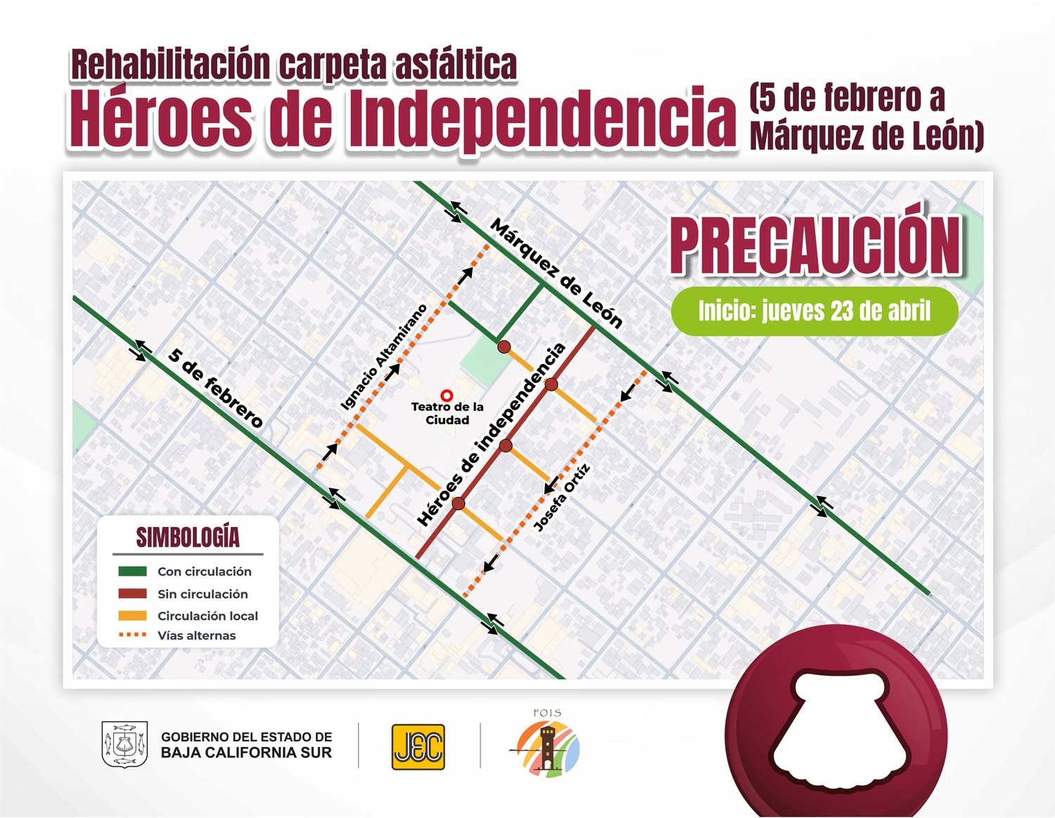 Con el objetivo de mejorar las condiciones de movilidad y seguridad vial en la capital del estado, la Junta Estatal de Caminos (JEC) iniciará los trabajos de renivelación con carpeta asfáltica en la calle Héroes de Independencia, en el tramo comprendido entre 5 de febrero y Manuel Márquez de León en la ciudad de La Paz, a partir del jueves 23 de abril de 2026.