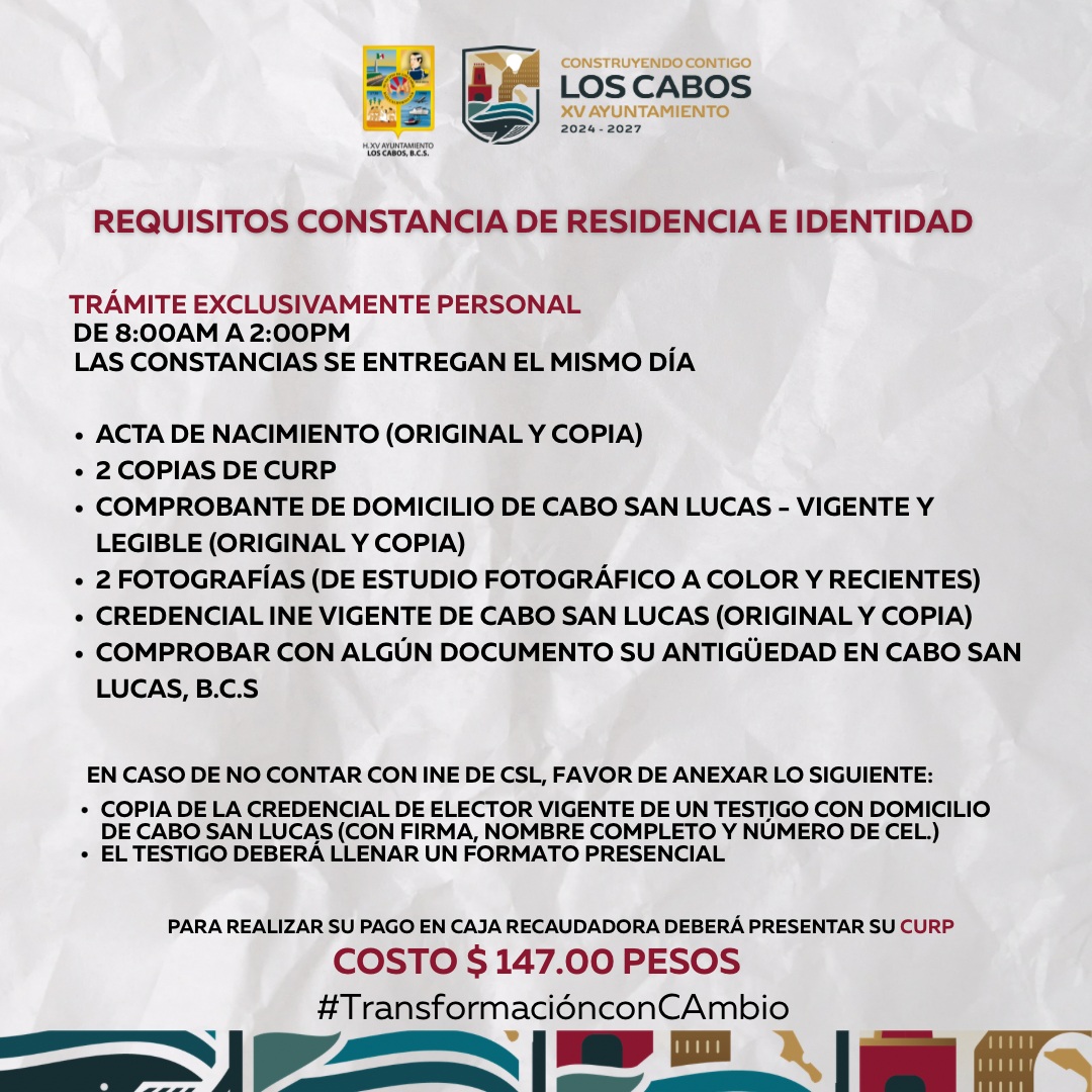 Los Cabos, Baja California Sur.– Con el propósito de facilitar a la ciudadanía el acceso a documentación oficial, se informa que el trámite de Carta de Residencia se mantiene de manera permanente en el edificio delegacional de Cabo San Lucas, documento requerido para diversos procesos como trámites legales, visa, pasaporte, licencia de conducir, acreditación de domicilio y gestiones relacionadas con terrenos, entre otros.