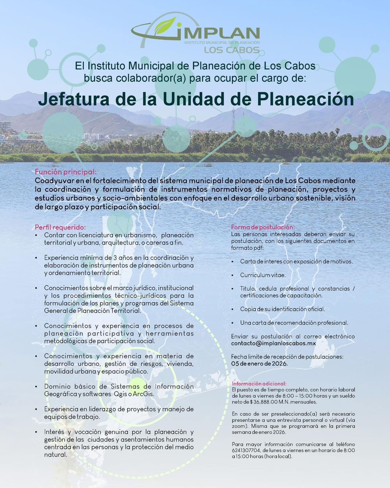 Los Cabos, Baja California Sur.- Con el objetivo de fortalecer el sistema municipal de planeación y los procesos técnicos que contribuyen al desarrollo urbano del municipio, el XV Ayuntamiento de Los Cabos, publicó la convocatoria emitida por el Instituto Municipal de Planeación (IMPLAN) para ocupar la Jefatura de la Unidad de Planeación.