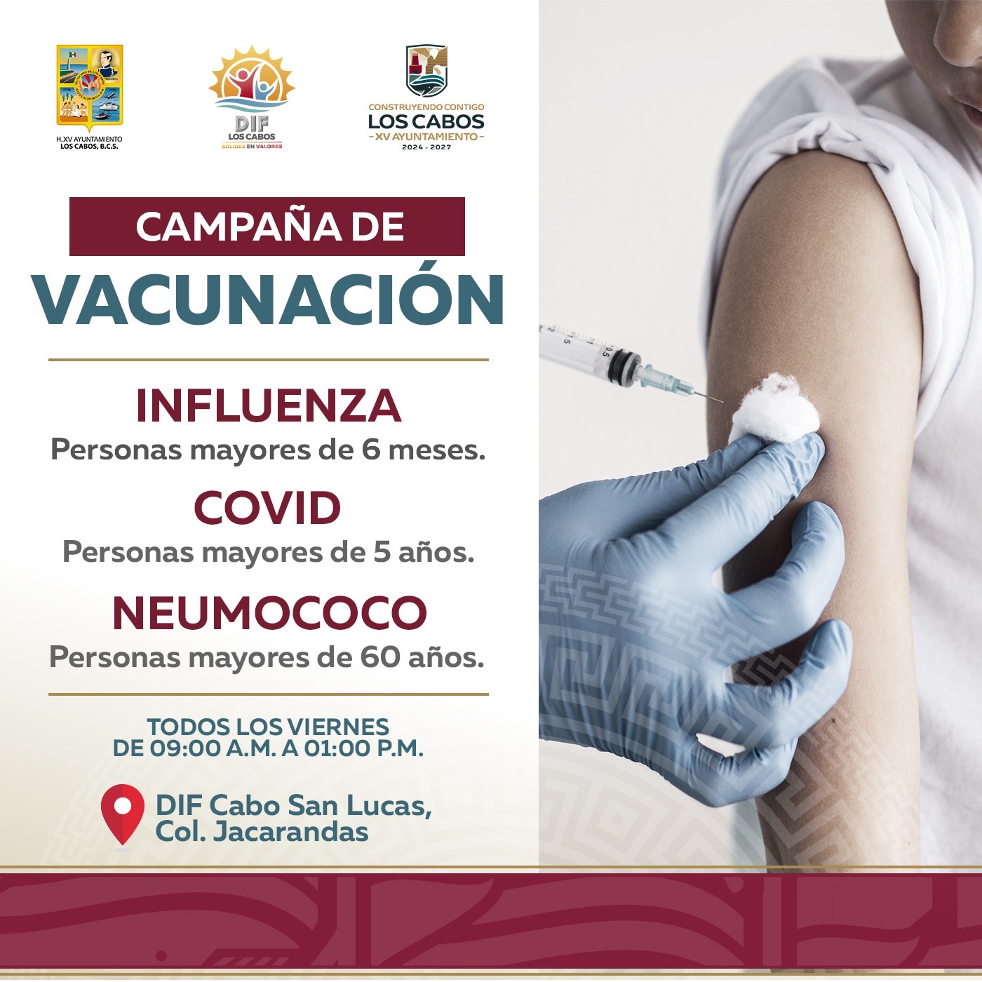 Los Cabos, Baja California Sur.- La Coordinación del Sistema para el Desarrollo Integral de la Familia (DIF) en Cabo San Lucas pone a disposición de la ciudadanía una campaña de vacunación que se llevará a cabo todos los viernes durante noviembre y diciembre de este año, programa que tiene como objetivo brindar a la población acceso gratuito a las vacunas contra la influenza, Covid-19 y neumococo.