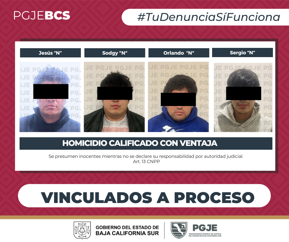 La Procuraduría General de Justicia del Estado (PGJE) informa que, tras presentar datos de prueba contundentes, obtuvo de un Juez de Control el auto de vinculación a proceso en contra de cuatro personas del sexo masculino, por su probable responsabilidad en el delito de homicidio calificado con ventaja.