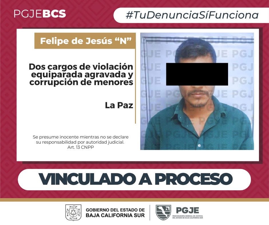 La Procuraduría General de Justicia del Estado (PGJE) de Baja California Sur, obtuvo en continuación de audiencia inicial por ejecución de orden de aprehensión, la vinculación a proceso de Felipe de Jesús “N” por dos cargos de violación equiparada agrava con violencia y un cargo de corrupción de menores en perjuicio de una niña.