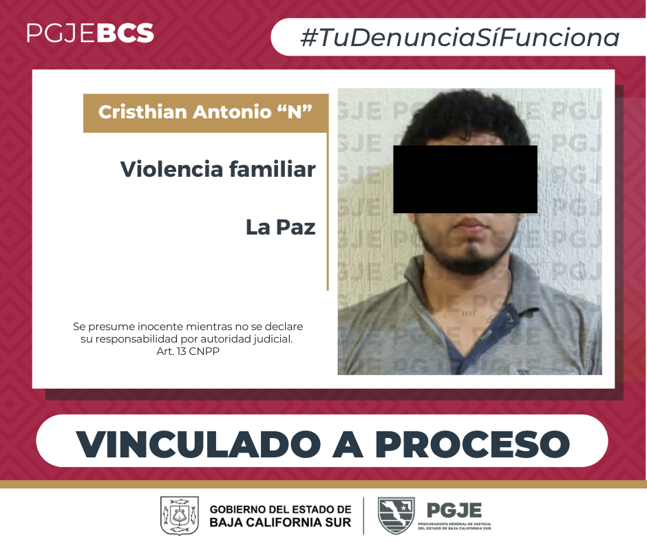 La Procuraduría General de Justicia del Estado(PGJE) de Baja California Sur, obtuvo vinculación a proceso de Cristian Antonio “N” por el delito de violencia familiar equiparada, durante audiencia de control de detención celebrada el 1 de marzo del presente año.