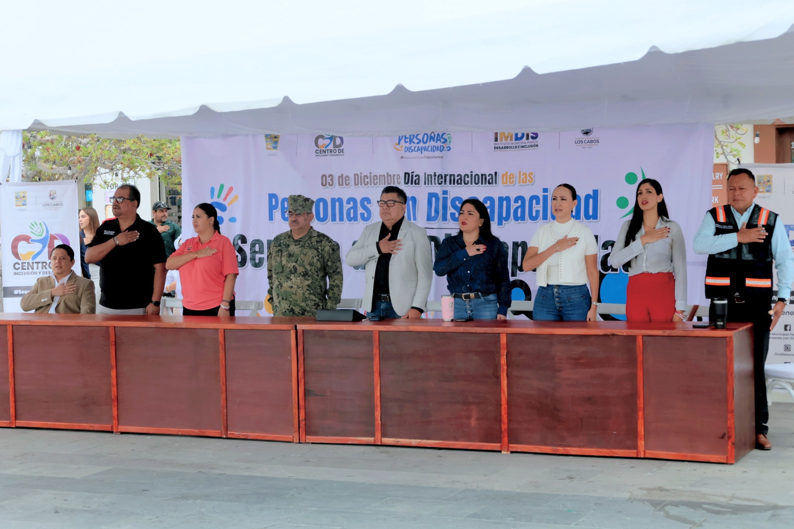 Los Cabos, Baja California Sur.- Durante la ceremonia de honores a la bandera, organizada por el Instituto Municipal para el Desarrollo e Inclusión de Personas con Discapacidad (IMDIS), el secretario general Alberto Rentería Santana encabezó el acto cívico en representación del presidente municipal, Christian Agúndez Gómez. En el evento participaron autoridades del XV Ayuntamiento de Los Cabos, integrantes del Cabildo, así como estudiantes, docentes y personal del servicio público.