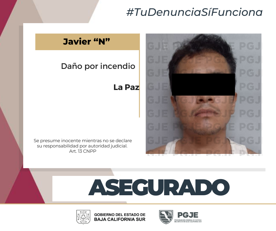 La Procuraduría General de Justicia del Estado (PGJE) de Baja California Sur informa que, para continuar con las acciones ministeriales para resolver la denuncia interpuesta por la víctimapor delito de daños agravados provocados por incendio, el martes 5 y el viernes 8 del mes en curso, cumplimentó ordenes de cateo en un domicilio de la colonia Pueblo Nuevo y, el jueves 14, elementos de la Agencia Estatal de Investigación Criminal (AEIC) cumplimentaron una orden de aprehensión en contra de un hombre de 24 años de edad.