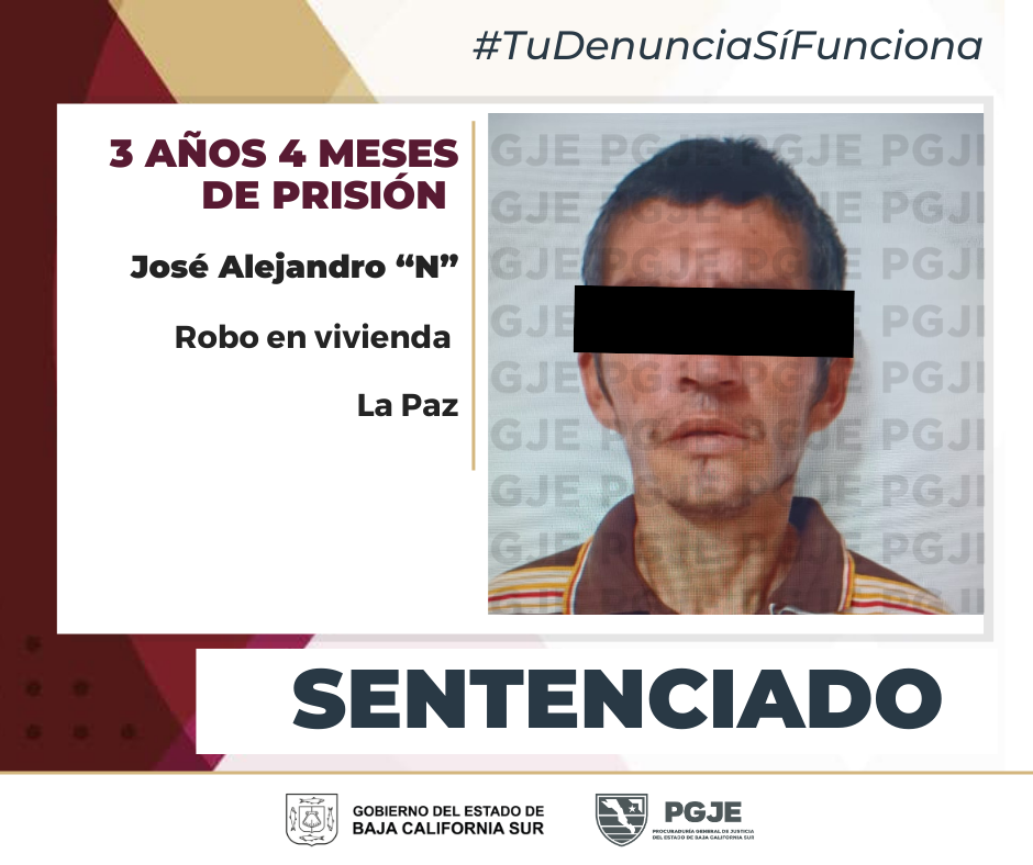 La Procuraduría General de Justicia del Estado (PGJE), logró que un Juez de Control dictara sentencia condenatoria mediante procedimiento abreviado en contra de un sujeto, a quien se logró acreditar su responsabilidad en la comisión del delito de robo cometido a vivienda.