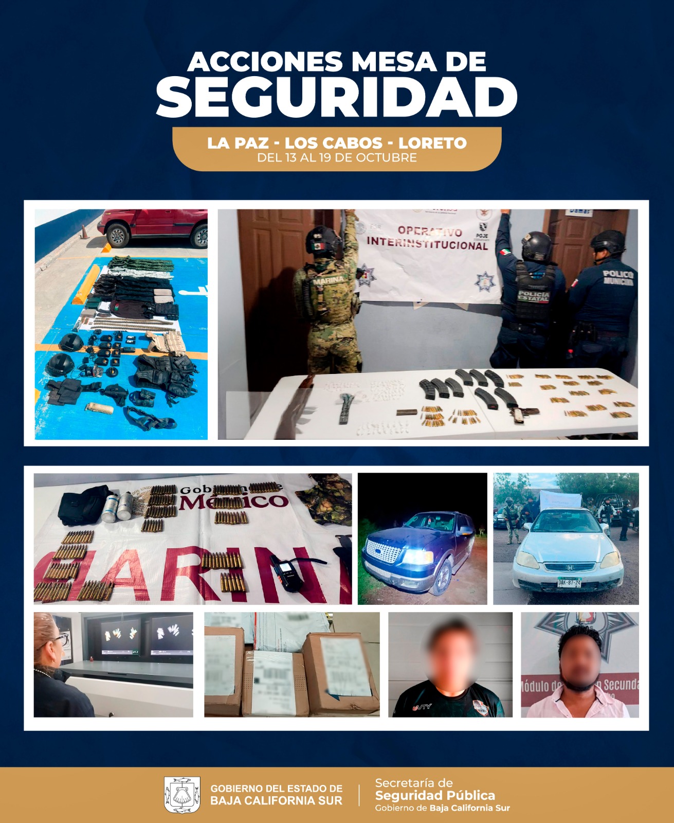 En el marco de las acciones coordinadas que realiza la Mesa Estatal de Seguridad para mantener el orden y la paz en Baja California Sur, informa los resultados obtenidos durante la semana del 13 al 19 de octubre en los municipios de La Paz, Los Cabos y Loreto.