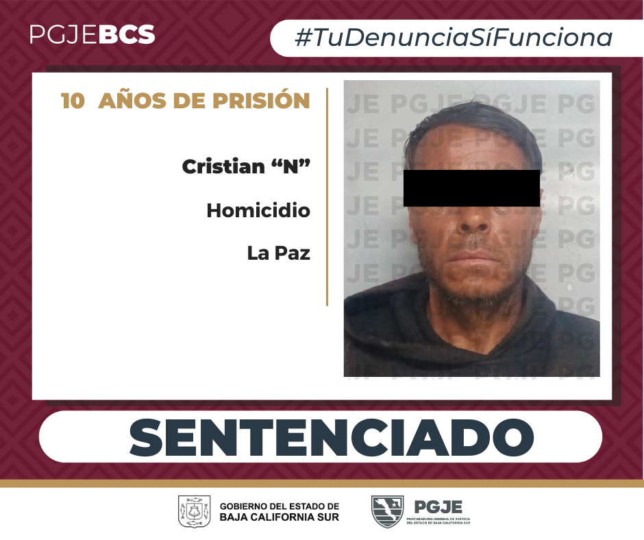 Derivado de la investigación exhaustiva y la presentación de datos de prueba contundentes, la Procuraduría General de Justicia del Estado (PGJE) de Baja California Sur, obtuvo una sentencia condenatoria de 10 años de prisión, en contra de Cristian Eduardo “N”, quien aceptó su responsabilidad en el delito de homicidio en agravio de un hombre y eligió la terminación anticipada, mediante procedimiento abreviado.