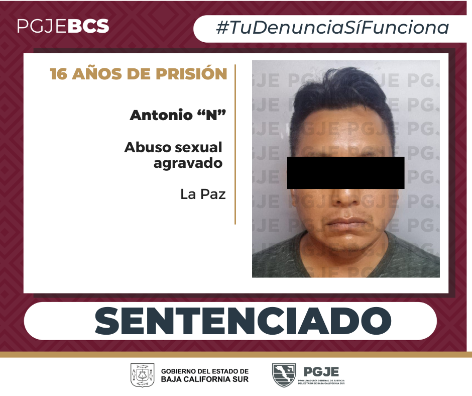 El martes 9 de septiembre del mes en curso, la Procuraduría General de Justicia del Estado (PGJE) por medio de la Subprocuraduría de Atención a Víctimas de Delitos Sexuales y Contra la Familia en La Paz, en procedimiento abreviado obtuvo del Juez de Control 4 sentencias condenatorias contra Antonio “N” en audiencia intermedia.