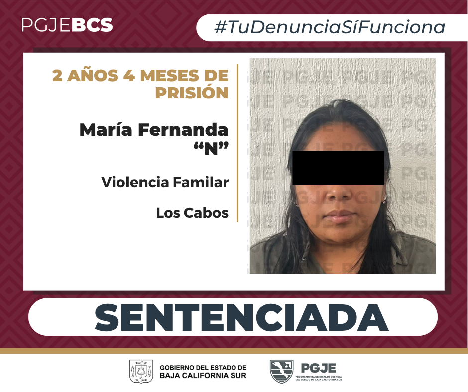 La Procuraduría General de Justicia del Estado (PGJE) logró que un Juez de Control dictara sentencia condenatoria mediante procedimiento abreviado en contra una mujer identificada como María Fernanda “N”, a quien logró acreditar su responsabilidad en la comisión del delito de violencia familiar por el que pasará 2 años y 4 meses en prisión.