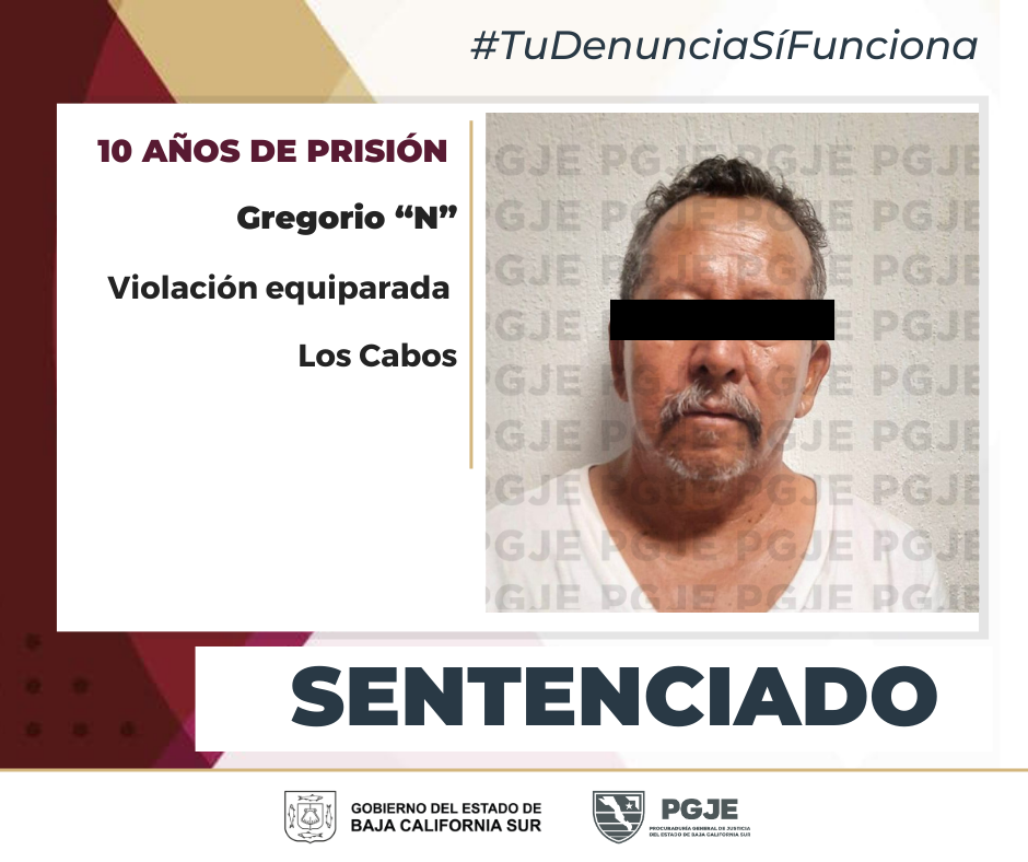 Sentencia de 10 años de prisión, 100 días de multa y el pago de atención psicológica de la víctima, obtuvo la Procuraduría General de Justicia del Estado (PGJE), por medio de la Subprocuraduría de Atención a Víctimas de Delitos Contra la Libertad Sexual y la Familia en audiencia de Procedimiento Abreviado que se efectuó el lunes 8 de julio en el Centro de Justicia Penal de San José del Cabo.